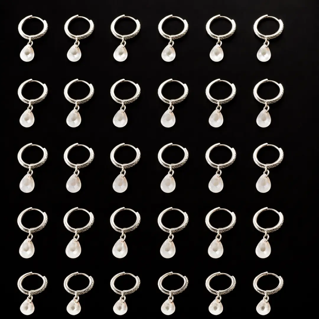 These elegant 925 Sterling Silver Hoop Earrings feature a classic huggie hoop design adorned with subtle CZ stone detailing and a graceful mother of pearl teardrop charm. The soft natural shimmer of the pearl drop adds a refined and feminine touch, making these earrings perfect for everyday elegance.