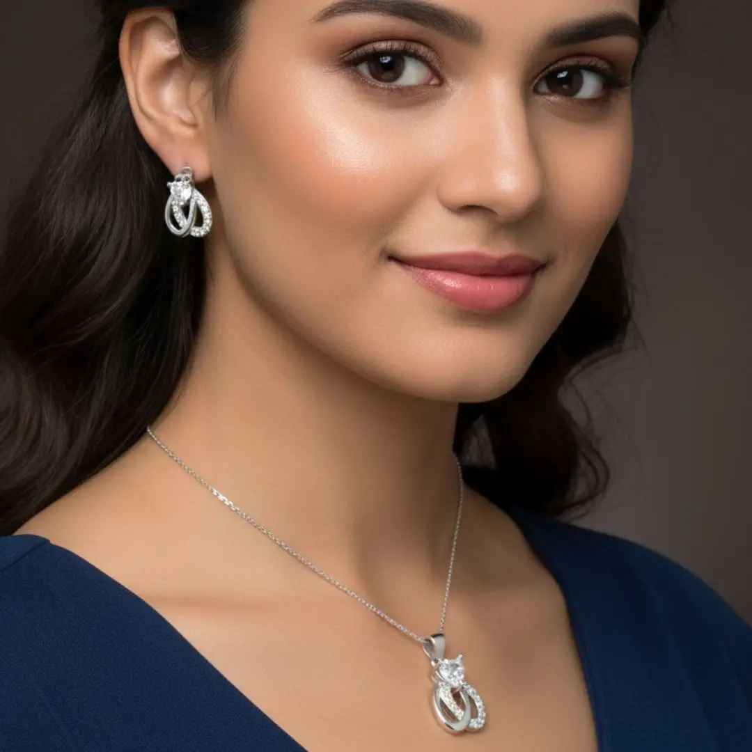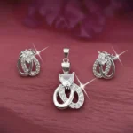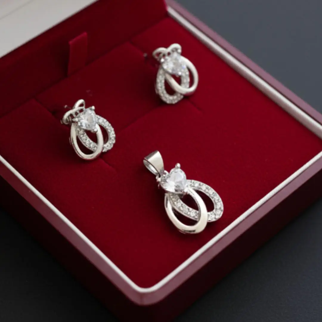 Celebrate timeless elegance with this beautifully crafted 925 Sterling Silver Pendant and Stud Earrings Set, featuring a romantic heart-cut cubic zirconia centerpiece. The design showcases graceful interlocking silver loops, one polished and one adorned with shimmering CZ stones, symbolizing unity, love, and connection.