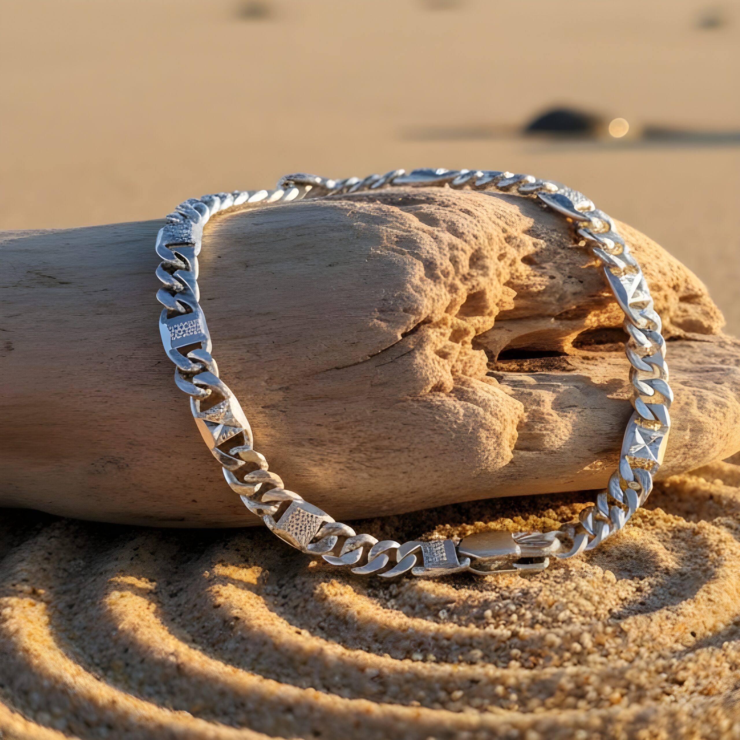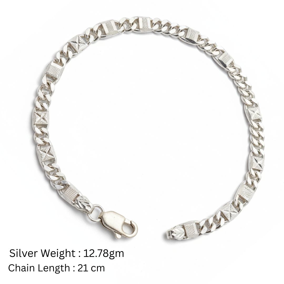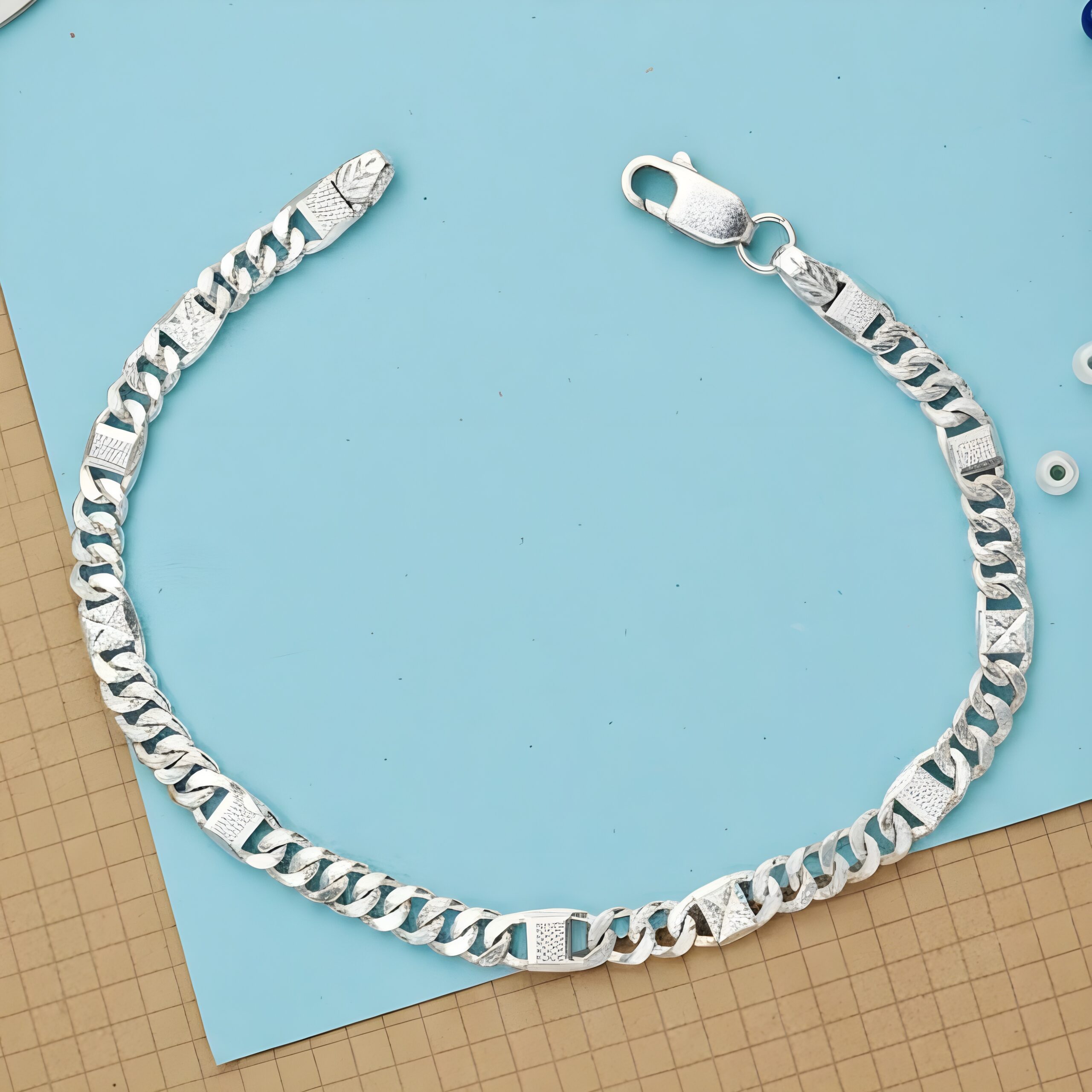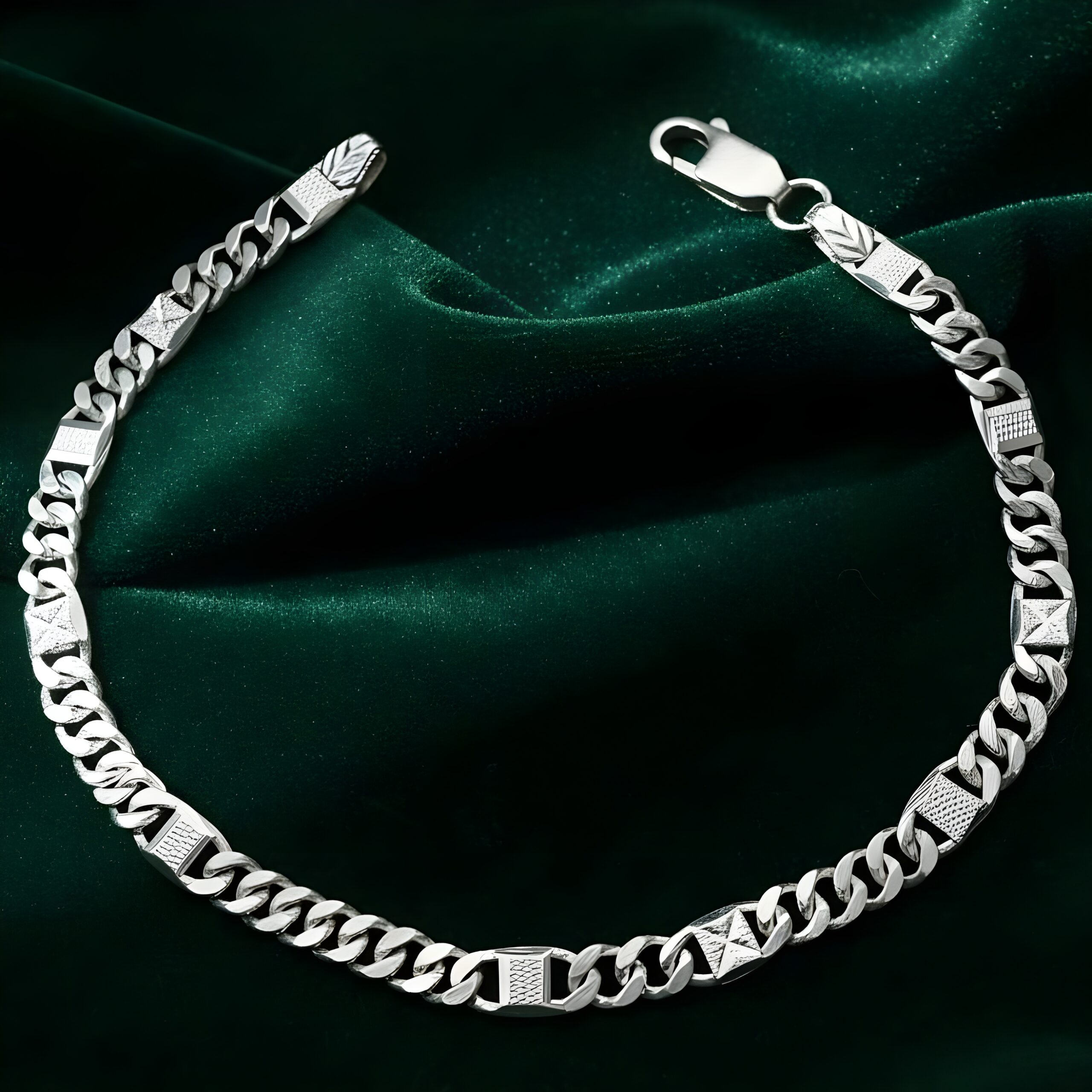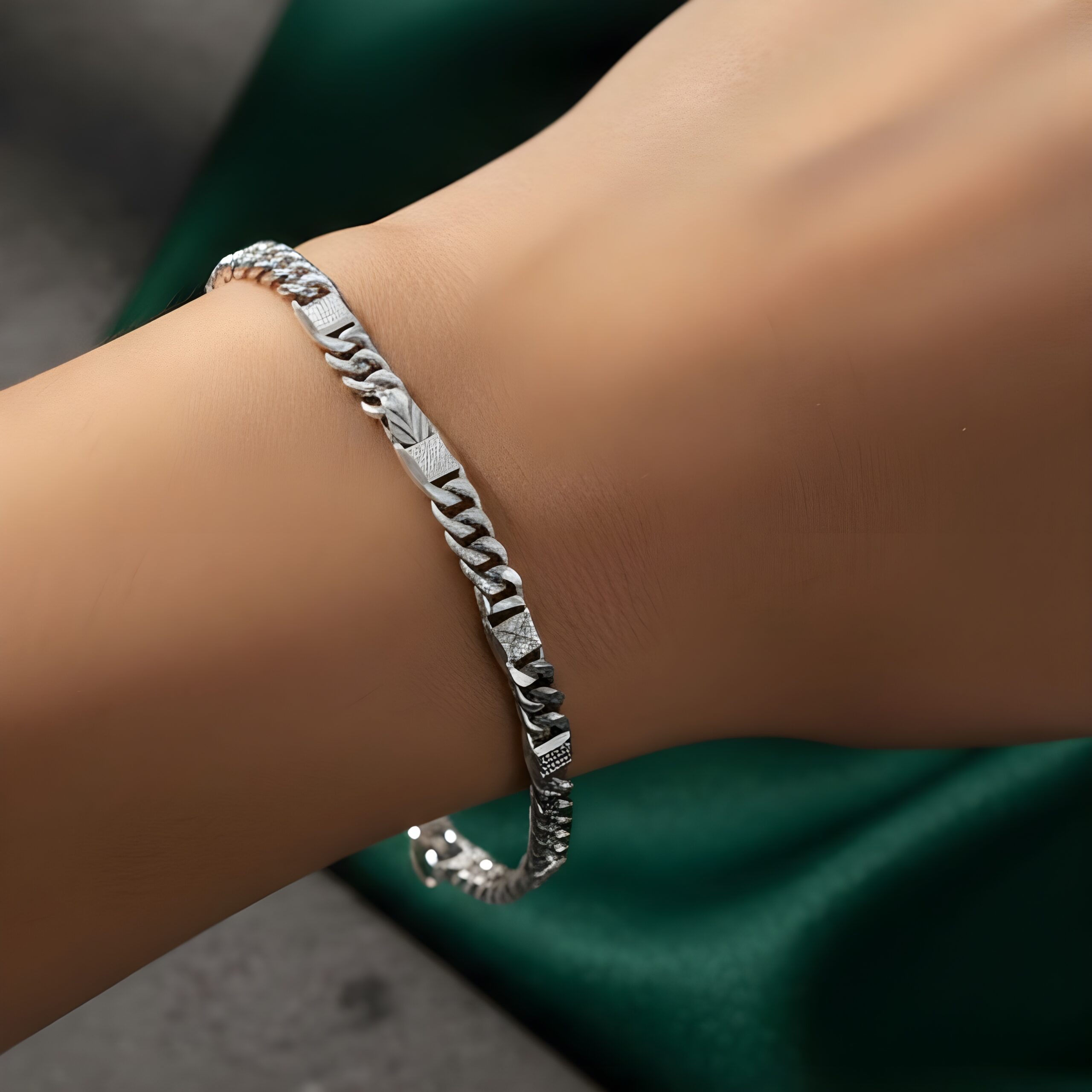 This distinguished bracelet combines the timeless appeal of a classic curb chain with unique, modern detailing, making it the perfect accessory for the contemporary man. Crafted from genuine 925 Sterling Silver, this piece offers both premium quality and a striking visual aesthetic.