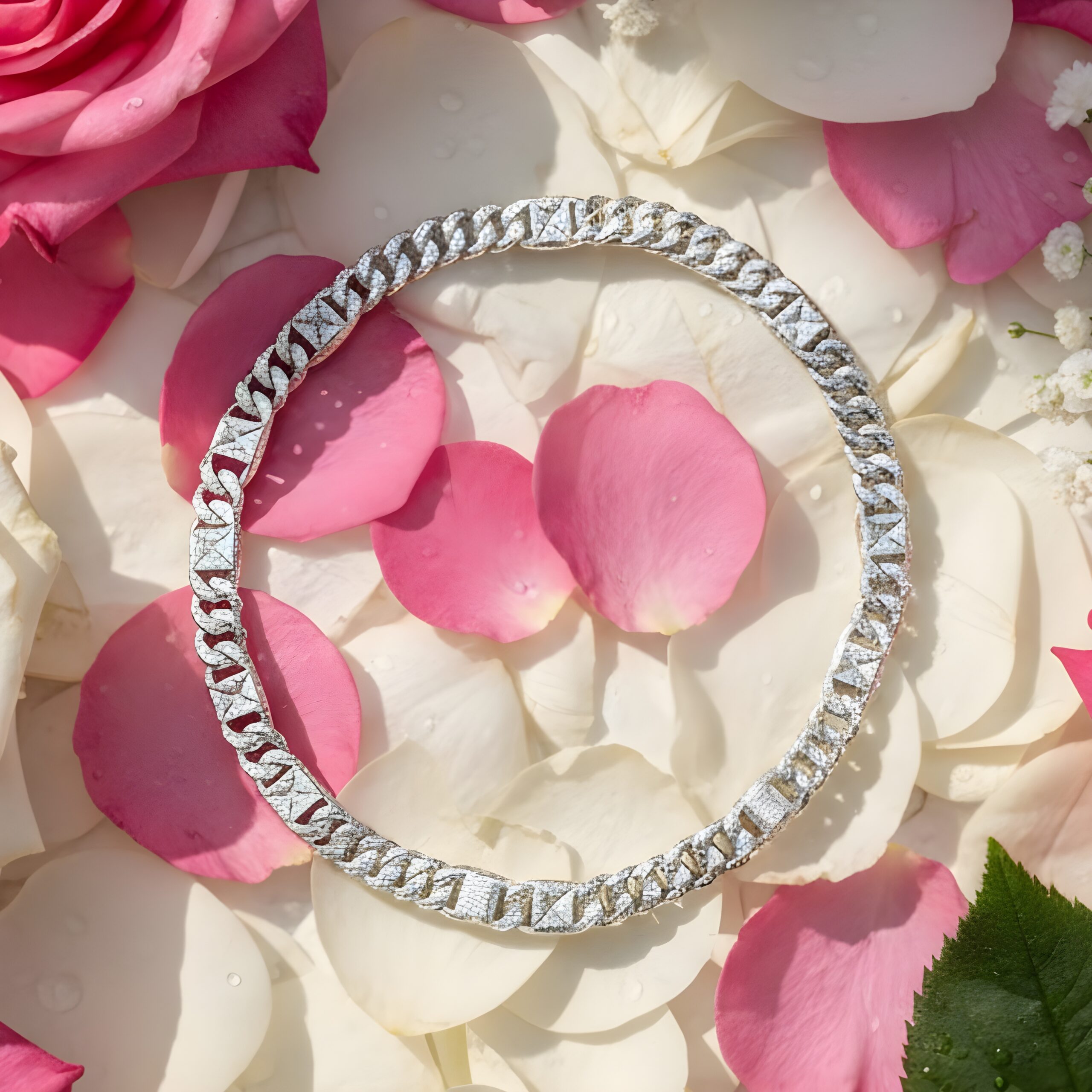 - Unique Design: Features a distinctive pattern of classic curb links alternating with rectangular links that have sophisticated etched and textured geometric designs (pyramids, cross-hatch).