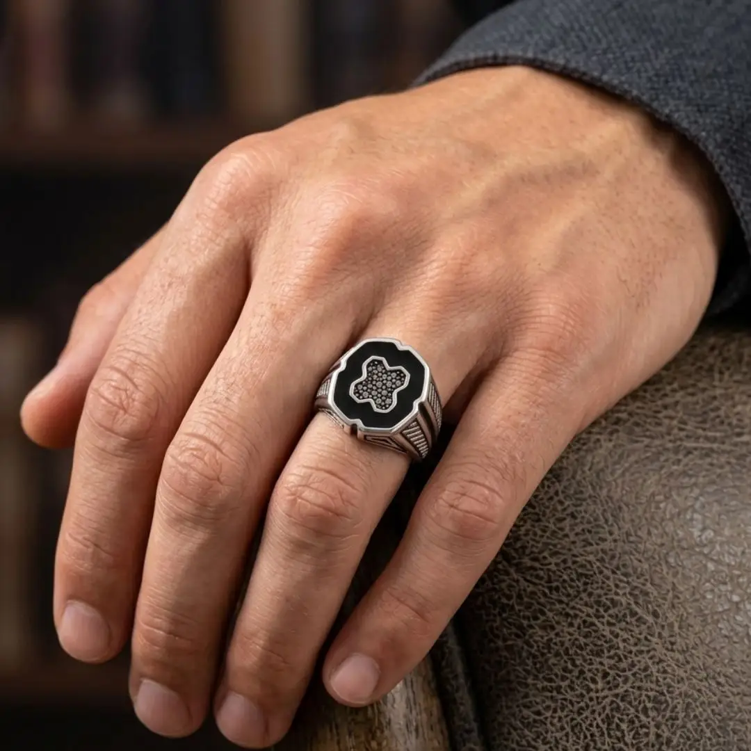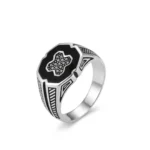 Make a bold statement with this exquisitely crafted 925 Sterling Silver Men’s Ring. Designed for the modern man who appreciates vintage aesthetics combined with contemporary craftsmanship, this ring features a striking octagonal face set with deep black enamel. At its center lies a silver micro-studded cross motif, adding a layer of sophisticated detail.