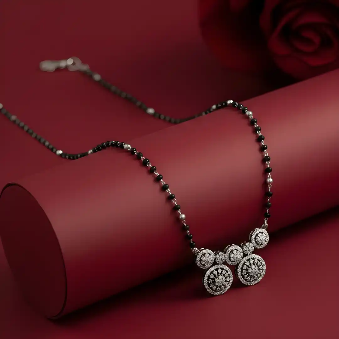 This graceful 925 Sterling Silver Mangalsutra is designed with a traditional black bead chain and a stunning multi-disc floral pendant arrangement. The circular motifs are beautifully detailed with sparkling stone settings, creating a rich yet balanced look that blends tradition with modern elegance.