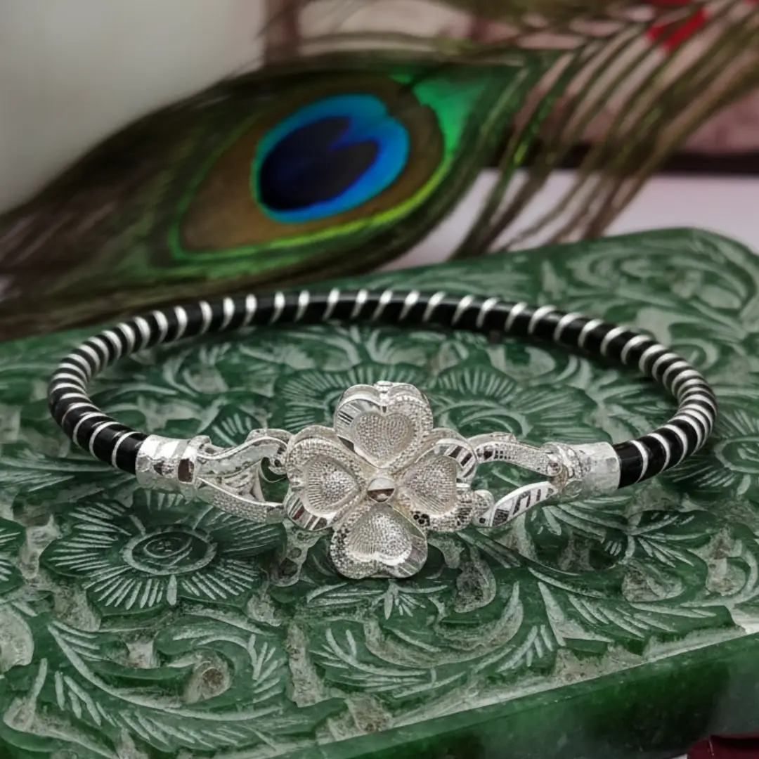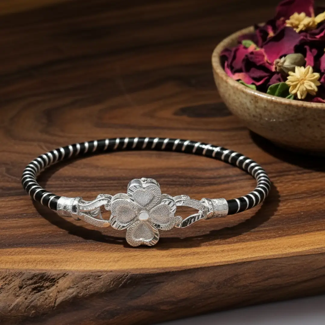 Enhance your ethnic elegance with this beautifully handcrafted 925 Sterling Silver Noya Bangle, designed with a delicate four-petal floral heart motif at the center.