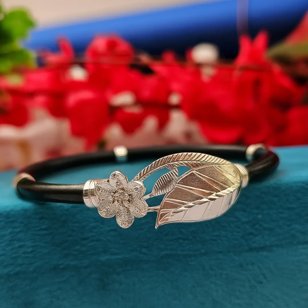 Enhance your traditional elegance with this exquisitely handcrafted 925 Sterling Silver Noya Bangle, designed with a graceful floral and leaf motif.