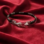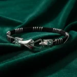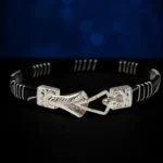 This elegant 925 Sterling Silver Noya Bangle features a classic hook-lock closure with bold silver end caps and a traditional black-accented band.