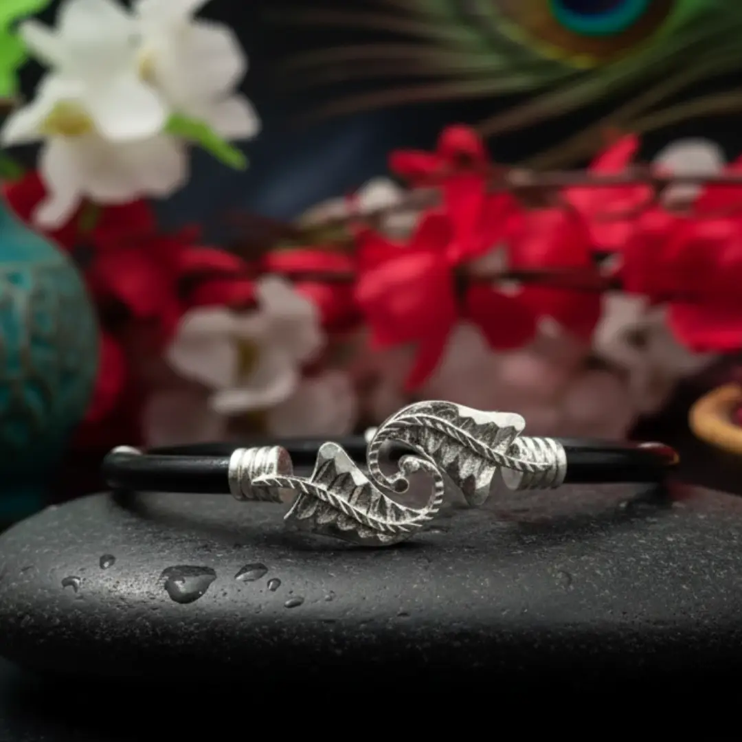 This elegant 925 Sterling Silver Noya Bangle is beautifully crafted with a graceful twin leaf swirl motif, inspired by nature and traditional Indian artistry.