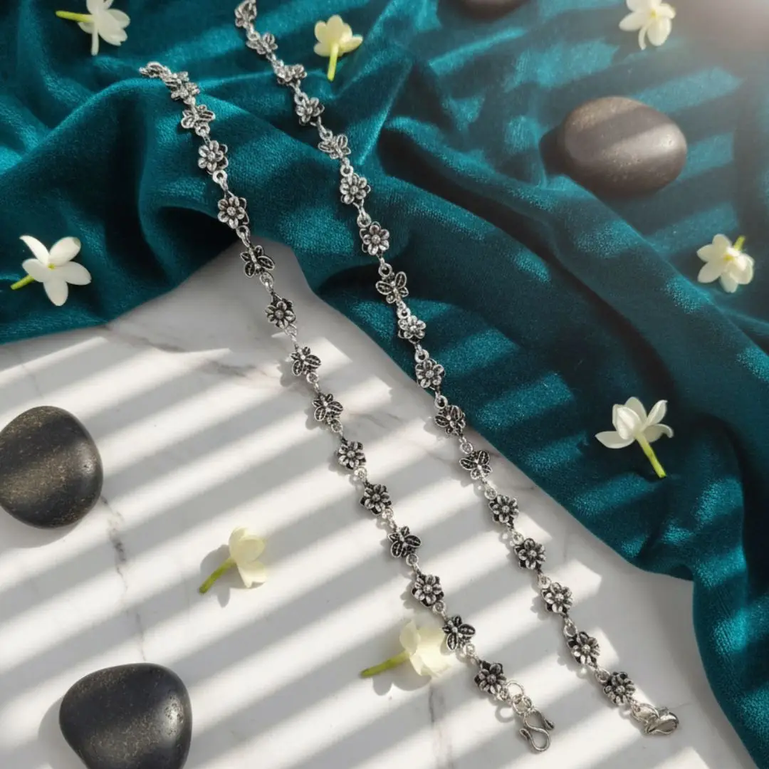 This elegant pair of 925 sterling silver anklets features a charming oxidized floral design, crafted with intricate detailing and linked with a fine silver chain. The antique finish gives a classic ethnic look, making these anklets perfect for daily wear as well as festive and traditional occasions.