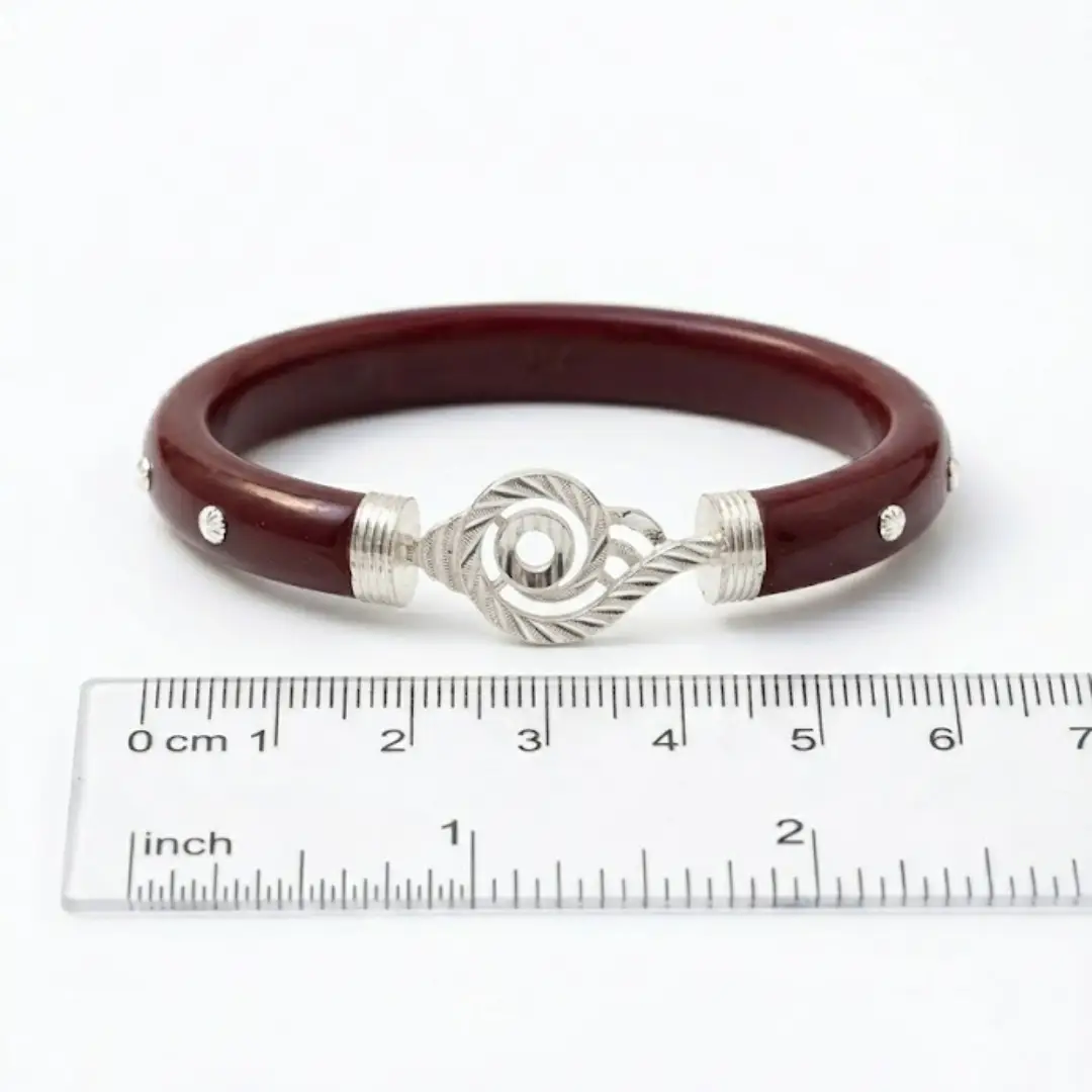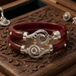 Elevate your traditional attire with these exquisite 925 Sterling Silver Pola Bangles. Traditionally worn for their cultural significance, these red Pola bangles are reimagined with premium 925 silver craftsmanship. Featuring intricate spiral silver overlays and a polished finish, they are the perfect blend of heritage and modern elegance.