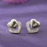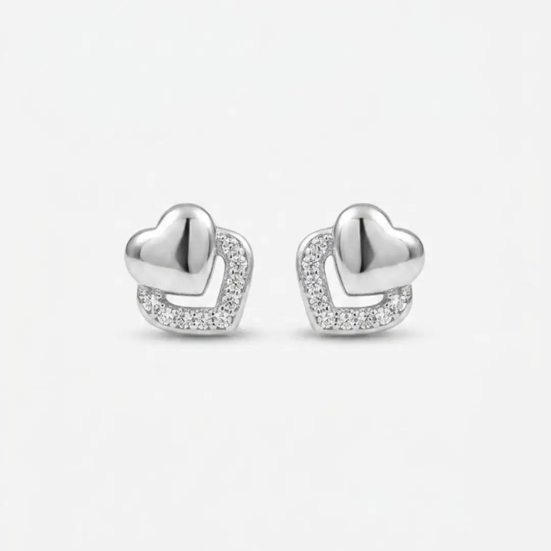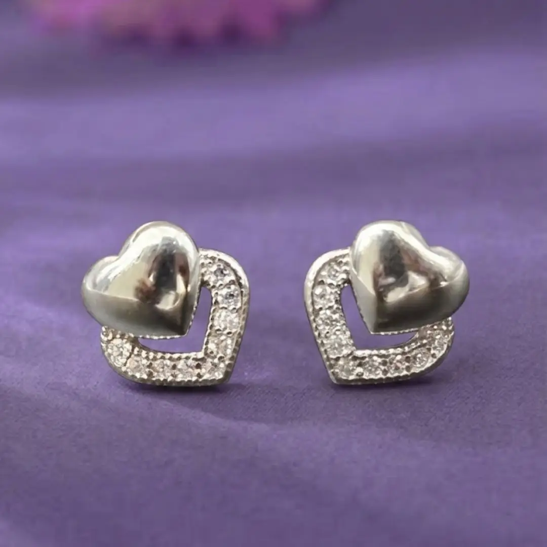 Celebrate love and elegance with these stunning 925 Sterling Silver heart earrings from The Velvet Box. This unique design features a beautiful “heart within a heart” concept—one heart crafted in smooth, polished high-shine silver, paired with a second heart delicately studded with brilliant cubic zirconia stones.
