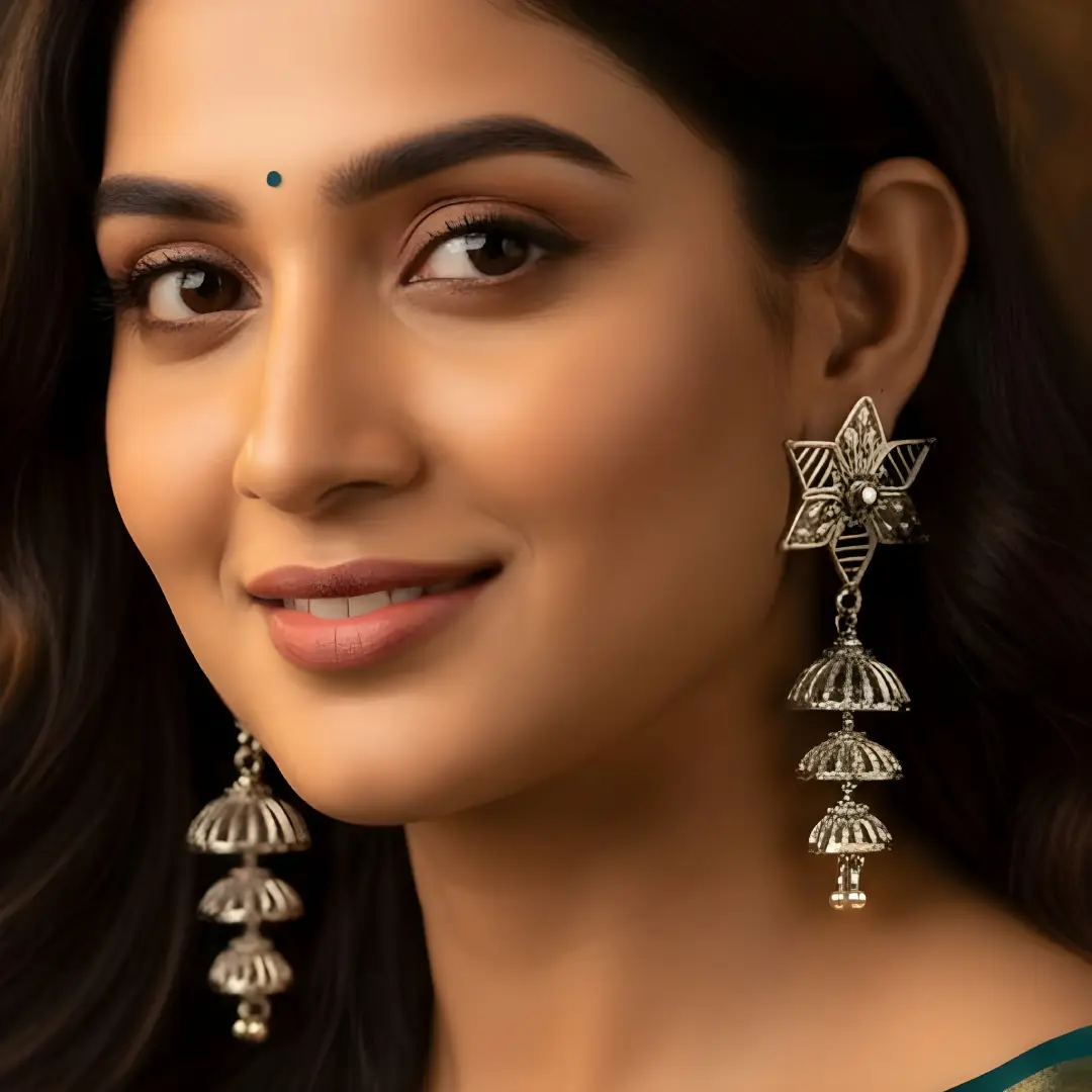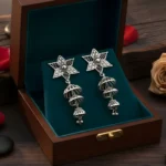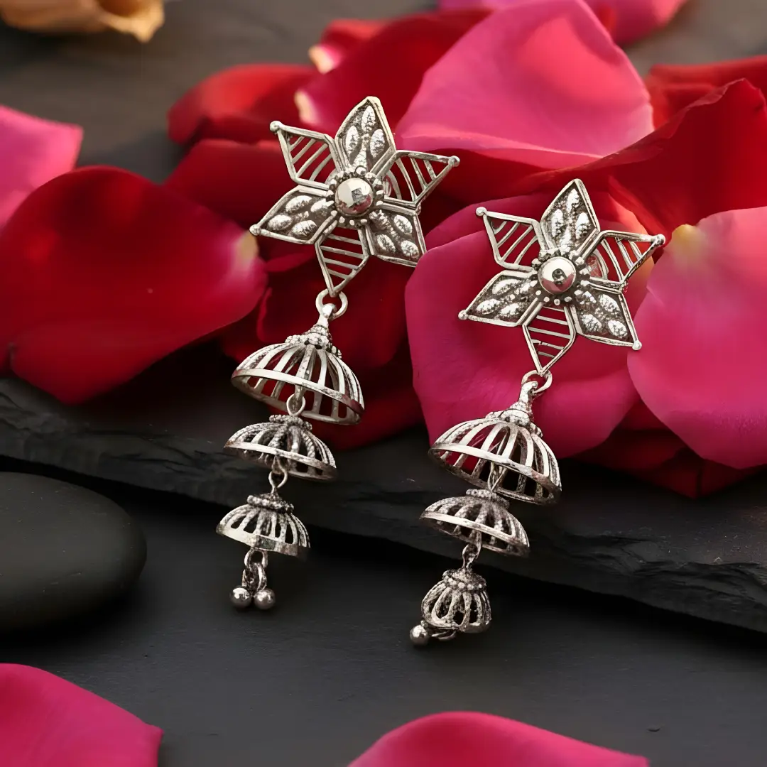 Make a statement with these uniquely designed 925 sterling silver jhumka earrings, featuring a striking star-shaped floral stud with intricate handcrafted detailing. Accented with a subtle central stone, the design flows into a graceful triple-layered openwork jhumka, creating beautiful movement and traditional charm. Perfect for festive occasions, weddings, and ethnic celebrations, these earrings blend bold design with classic Indian artistry.