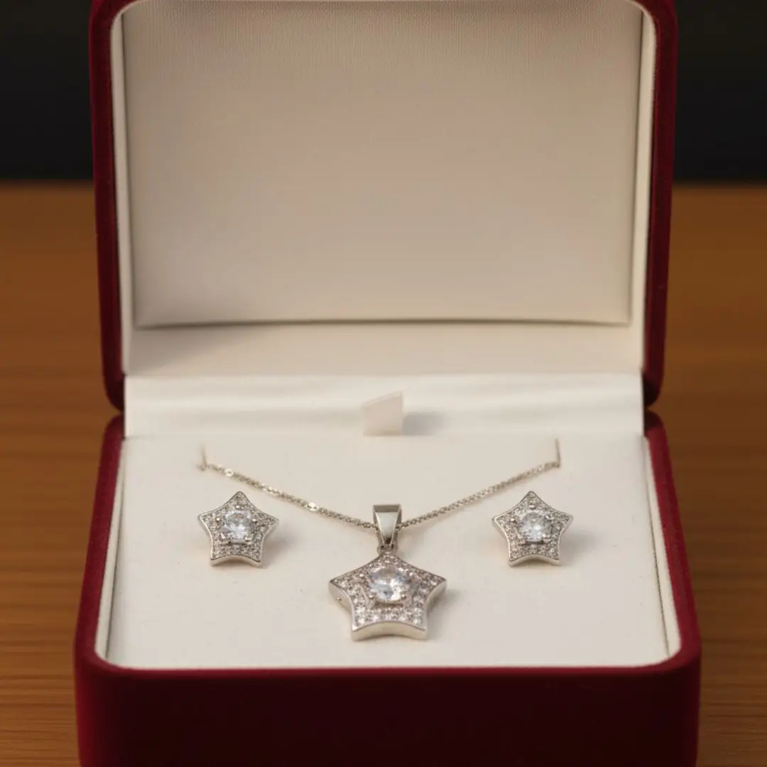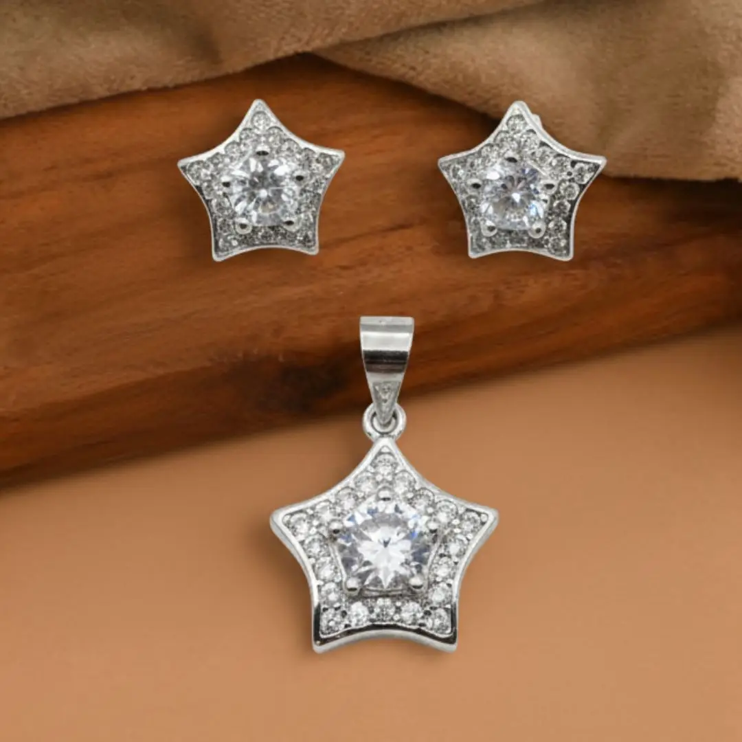 Shine bright with this elegant 925 Sterling Silver Star Pendant and Stud Earrings Set, designed to add a touch of celestial charm to your everyday and occasion wear. Each piece features a brilliant round-cut cubic zirconia at the center, beautifully surrounded by finely set CZ stones that enhance its radiant sparkle.