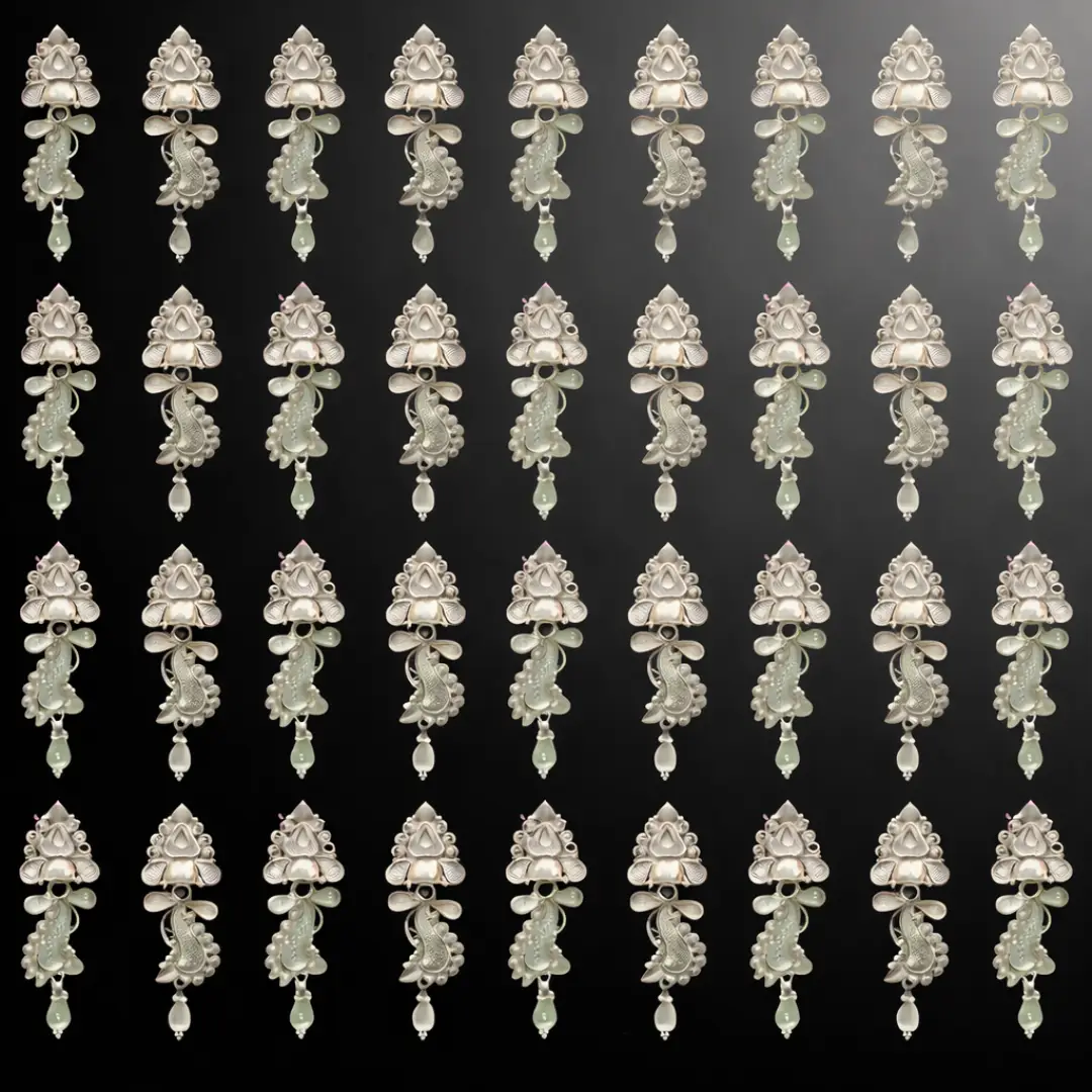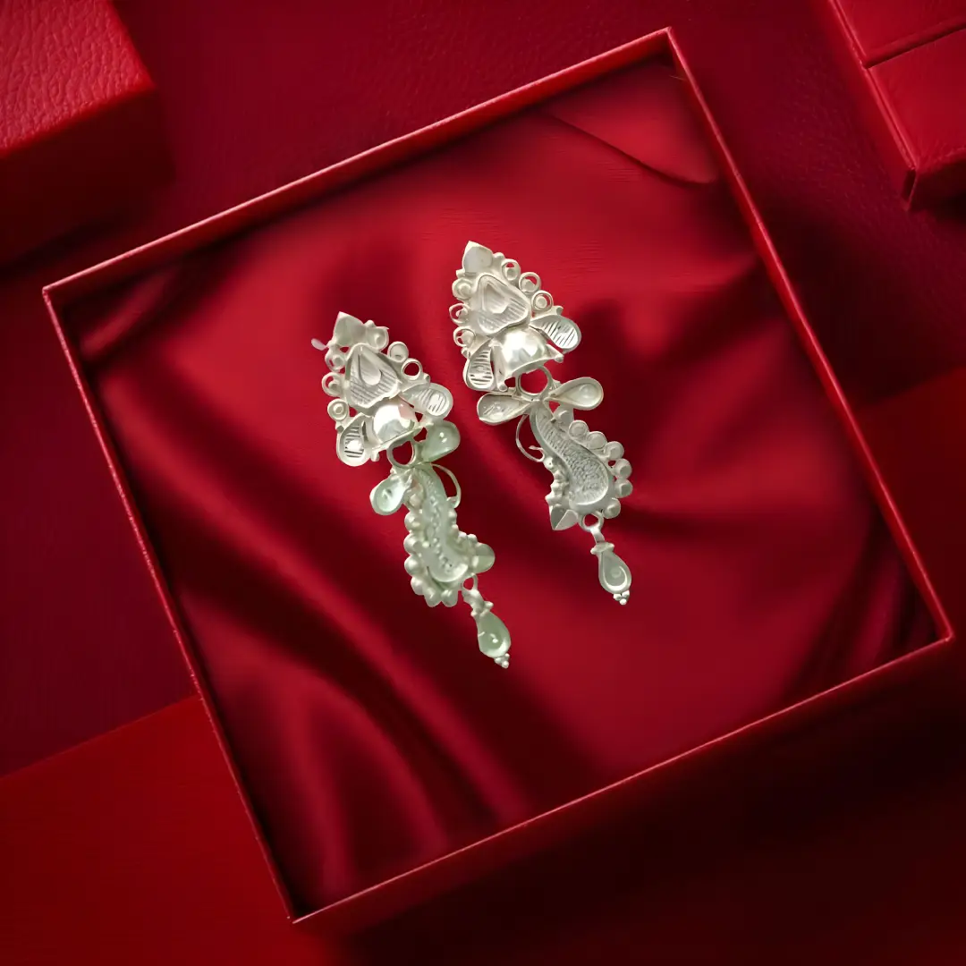 These beautifully crafted 925 Sterling Silver Earrings showcase a traditional handcrafted design with intricate detailing and graceful dangling elements. The ornate motifs reflect classic ethnic artistry, making these earrings a perfect blend of heritage and elegance.