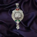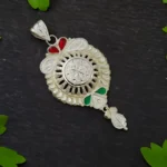 This elegant 925 Sterling Silver handcrafted pendant features a striking circular centerpiece with finely detailed openwork and textured patterns inspired by traditional Indian jewellery. Accented with subtle meenakari enamel highlights in red and green, the pendant is enhanced by an antique silver finish that brings out its intricate craftsmanship. A delicate dangling drop at the bottom adds graceful movement, making it perfect for ethnic wear, festive occasions, and traditional celebrations.