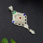 This stunning 925 Sterling Silver traditional pendant features an elegant circular floral pattern highlighted with detailed filigree craftsmanship. Accented with vibrant meenakari enamel in green, blue, and red, the pendant reflects classic Indian heritage aesthetics. The antique silver finish enhances the intricate texture, while the graceful heart-shaped and drop danglers add movement and charm.