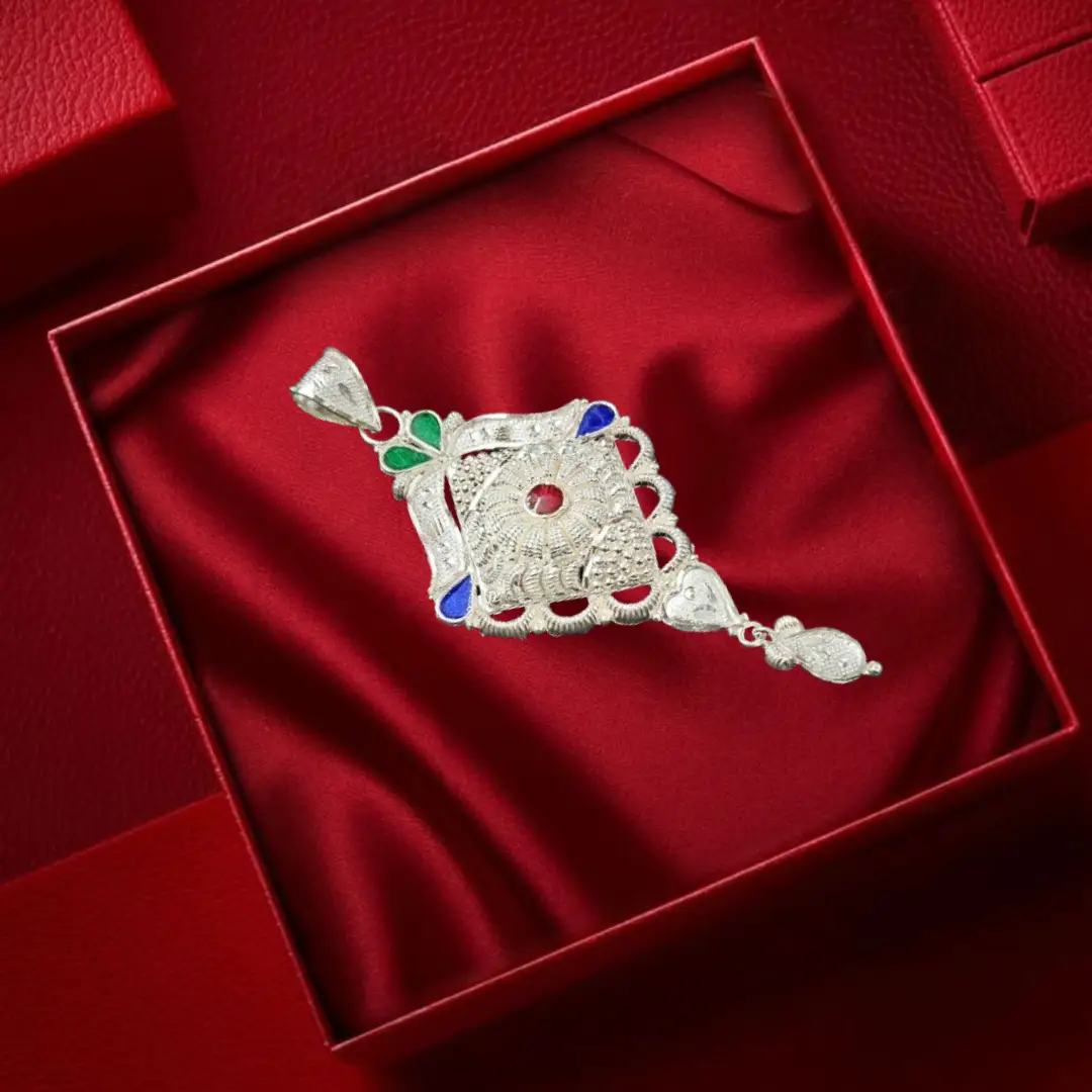 Perfect for ethnic wear, festive occasions, weddings, and cultural celebrations, this pendant pairs beautifully with silver chains and traditional outfits, making it a timeless jewellery piece.