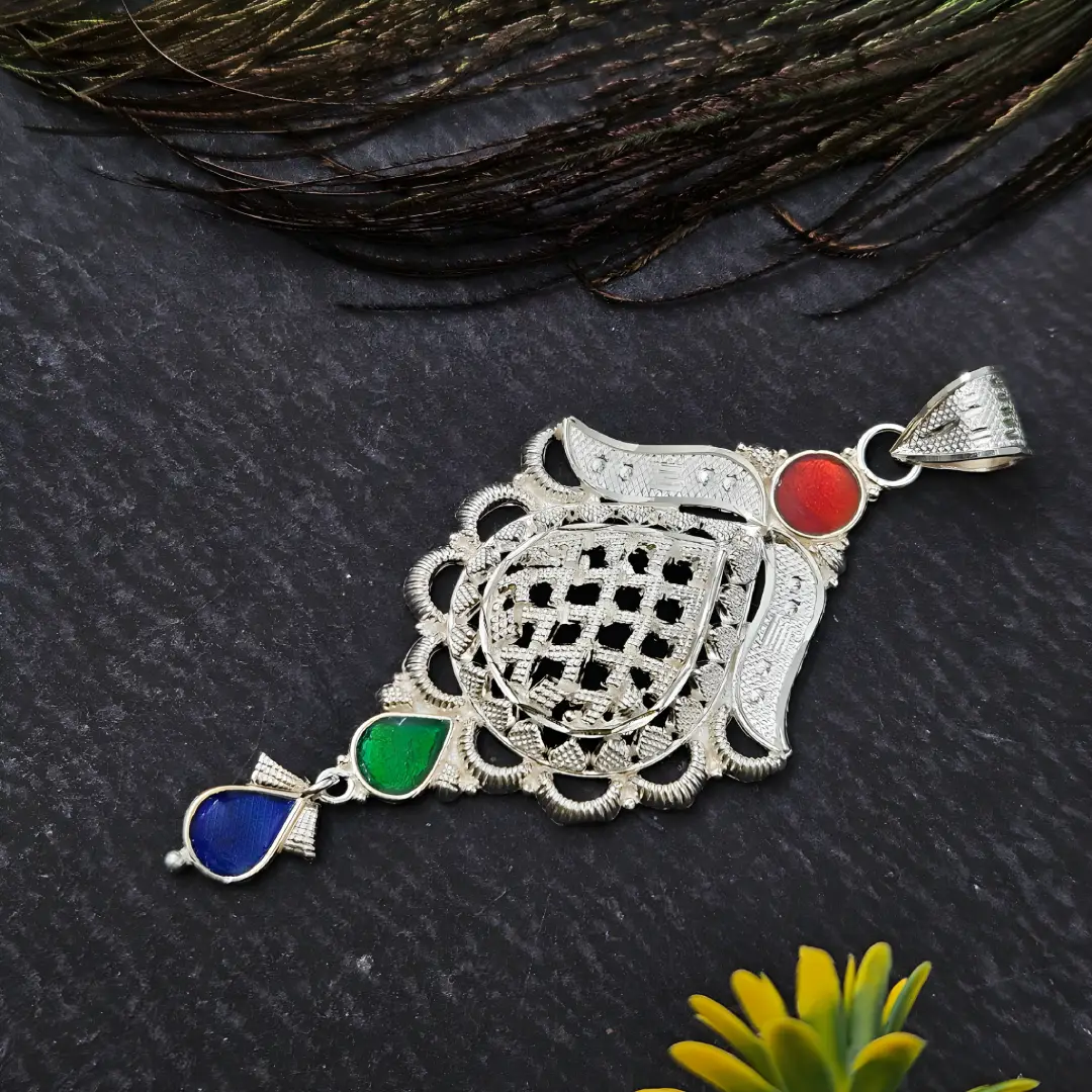 This elegant 925 Sterling Silver handcrafted pendant showcases intricate openwork filigree craftsmanship inspired by traditional Indian design. Accented with rich meenakari enamel in red, green, and blue, the pendant features a graceful layered structure with a delicate dangling drop that adds movement and charm. The antique silver finish enhances its heritage appeal, making it a perfect accessory for ethnic wear, festive occasions, and cultural celebrations.