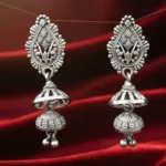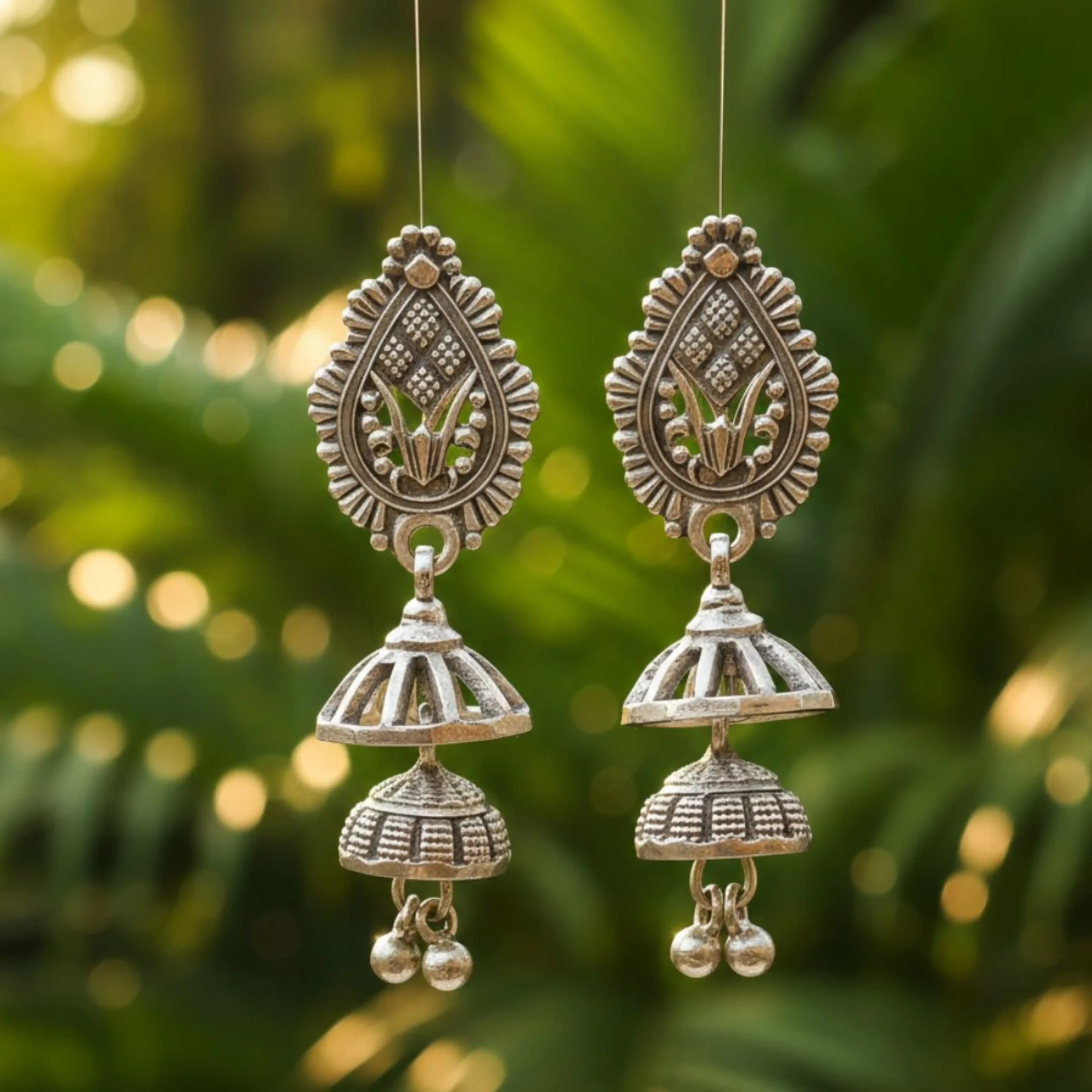 Enhance your ethnic look with these exquisitely crafted 925 sterling silver jhumka earrings. Featuring a classic teardrop-shaped stud with intricate oxidised detailing and layered dome jhumkas, these earrings reflect rich traditional artistry. The beautifully carved patterns and hanging silver beads add a graceful charm and subtle movement. Perfect for festivals, weddings, and cultural occasions, these jhumkas blend heritage design with everyday elegance.