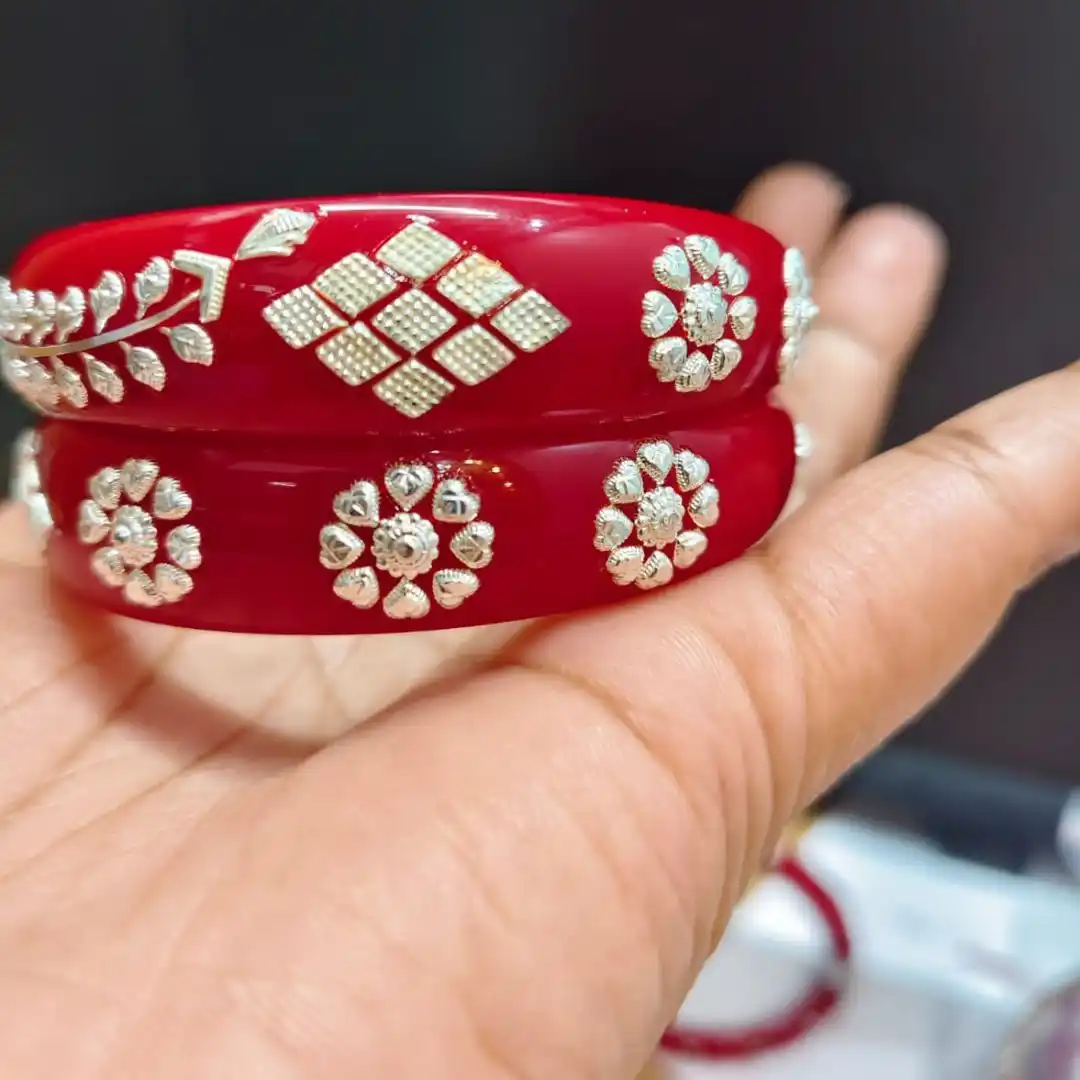 Enhance your traditional look with this elegant Red Pola Bangle Pair, beautifully crafted with premium silver floral motifs. Inspired by classic Bengali wedding jewelry, these bangles symbolize love, purity, and prosperity.