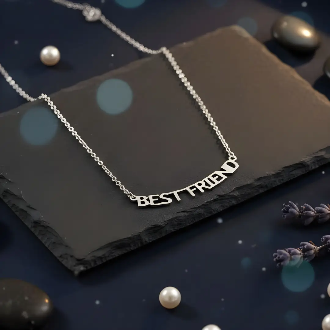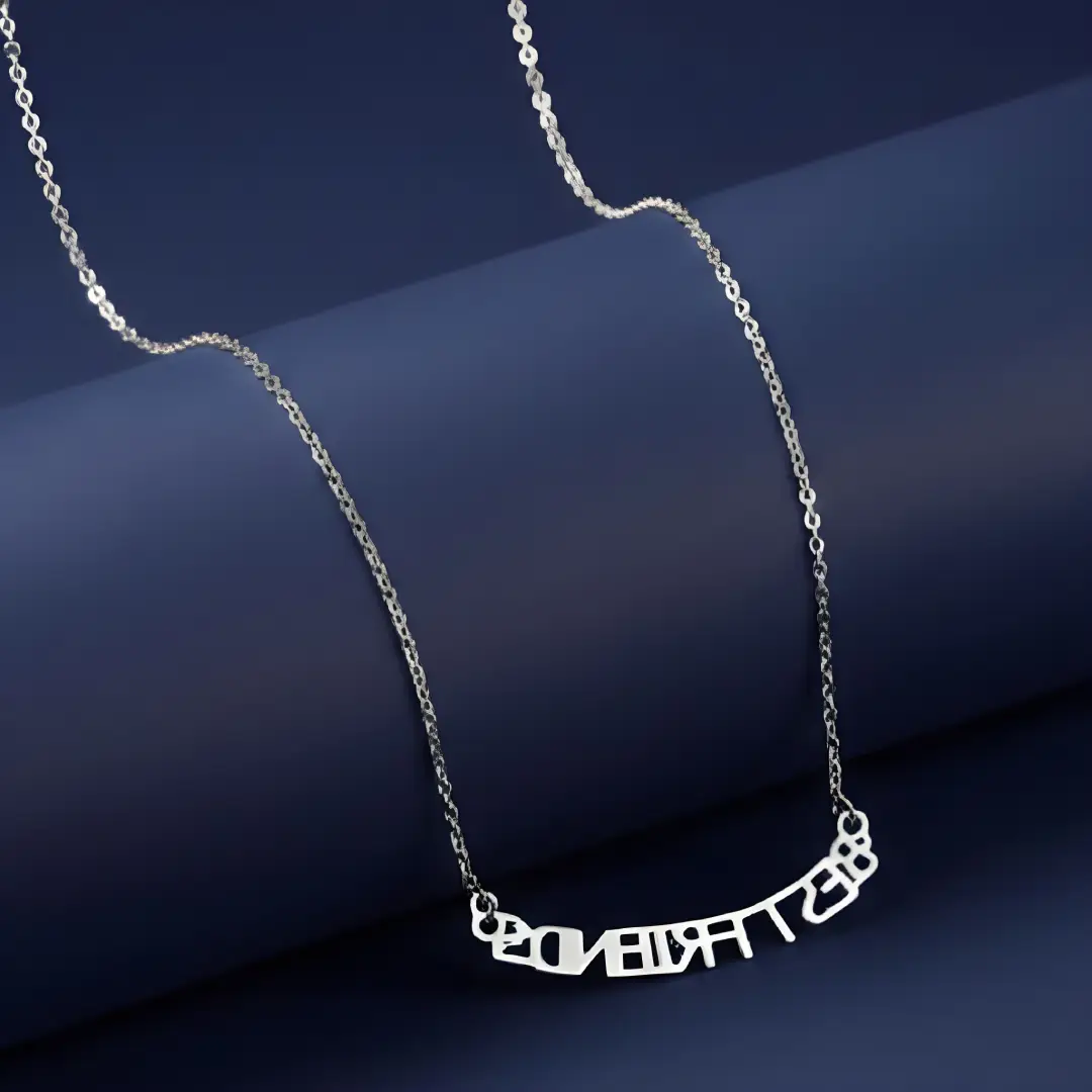 This charming necklace features a playful and heartfelt “BEST FRIENDS” word pendant in a modern, cut-out letter design. The silver-tone metal and delicate chain give it a sleek and contemporary feel, making it a perfect gift to celebrate meaningful friendships. Whether worn solo or paired with a matching piece, this necklace is a stylish token of connection and loyalty.
