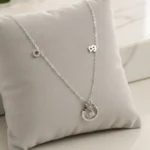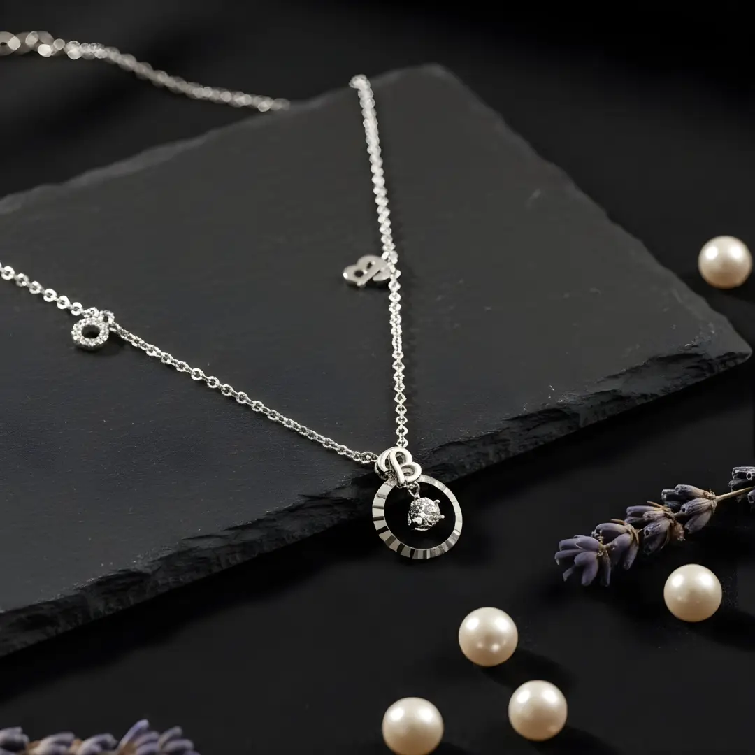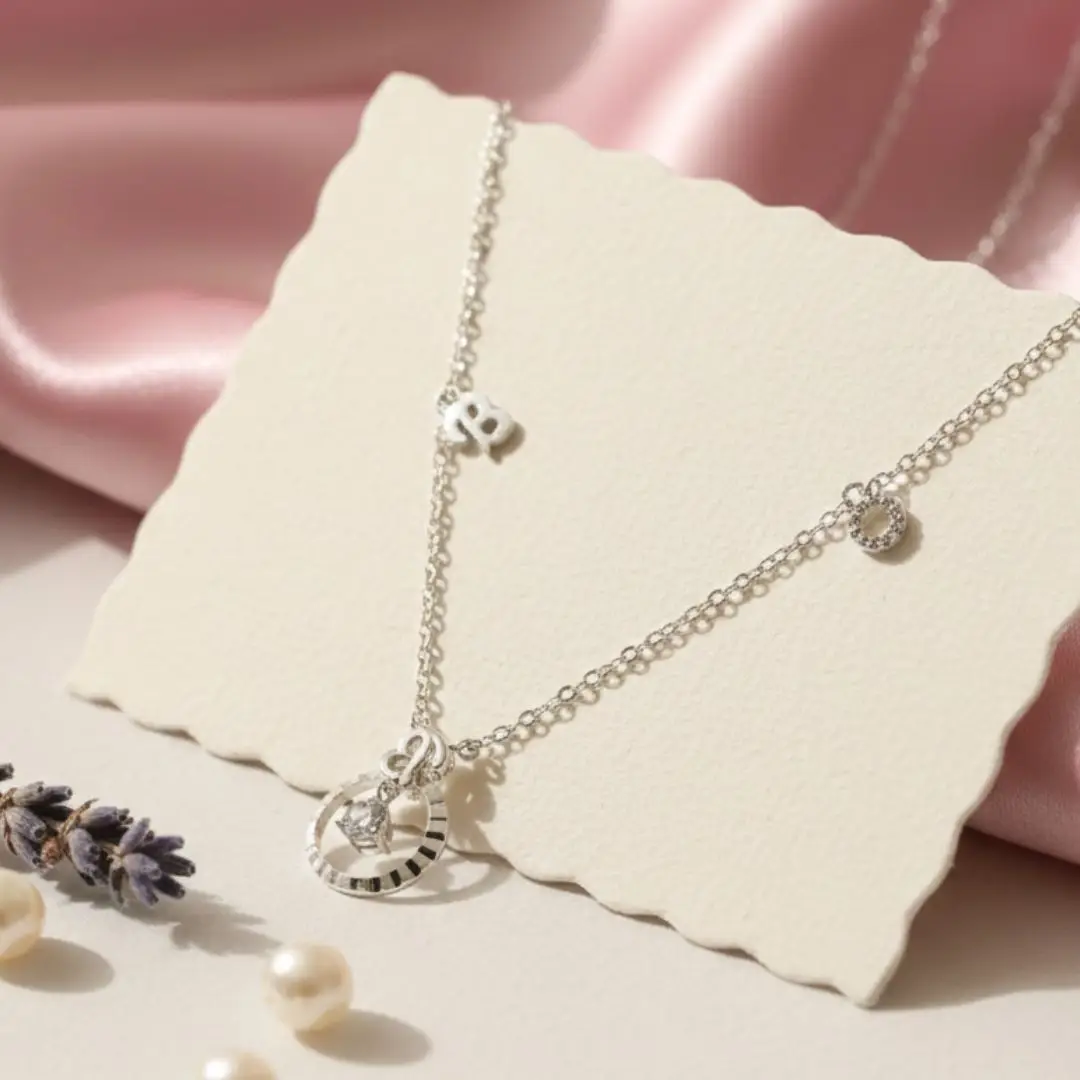 Elevate your look with this stylish asymmetric charm necklace featuring a stunning circular pendant adorned with a sparkling heart-shaped crystal. The fine silver-tone chain is accented with tiny charm details, including a letter “B” and a crystal-studded circle, adding a playful and personalized touch.