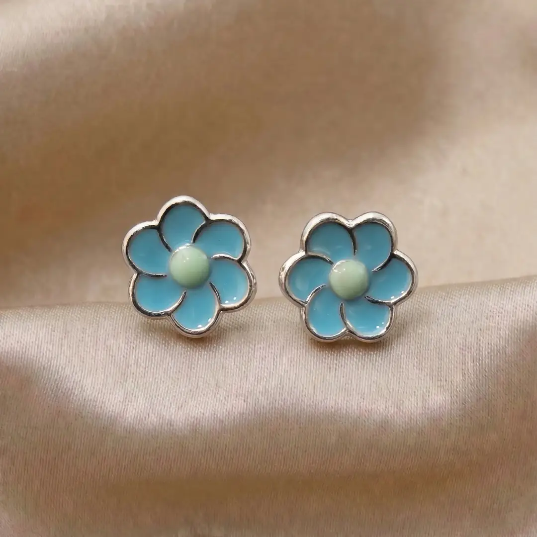 Add a refreshing pop of color to your style with our Blue Flower Enamel 925 Silver Stud Earrings. These handcrafted earrings feature a charming five-petal flower design in a bright sky-blue enamel with a contrasting mint-green center, all set in high-quality 925 sterling silver. Perfect for those who love cheerful, nature-inspired accessories, these stud earrings are a versatile addition to any jewelry box.