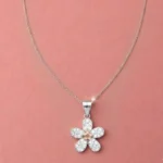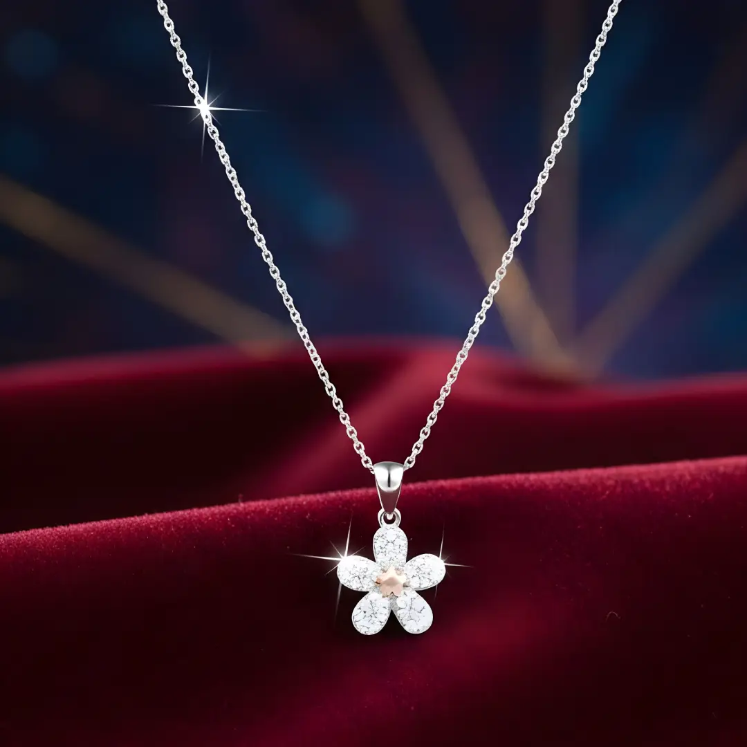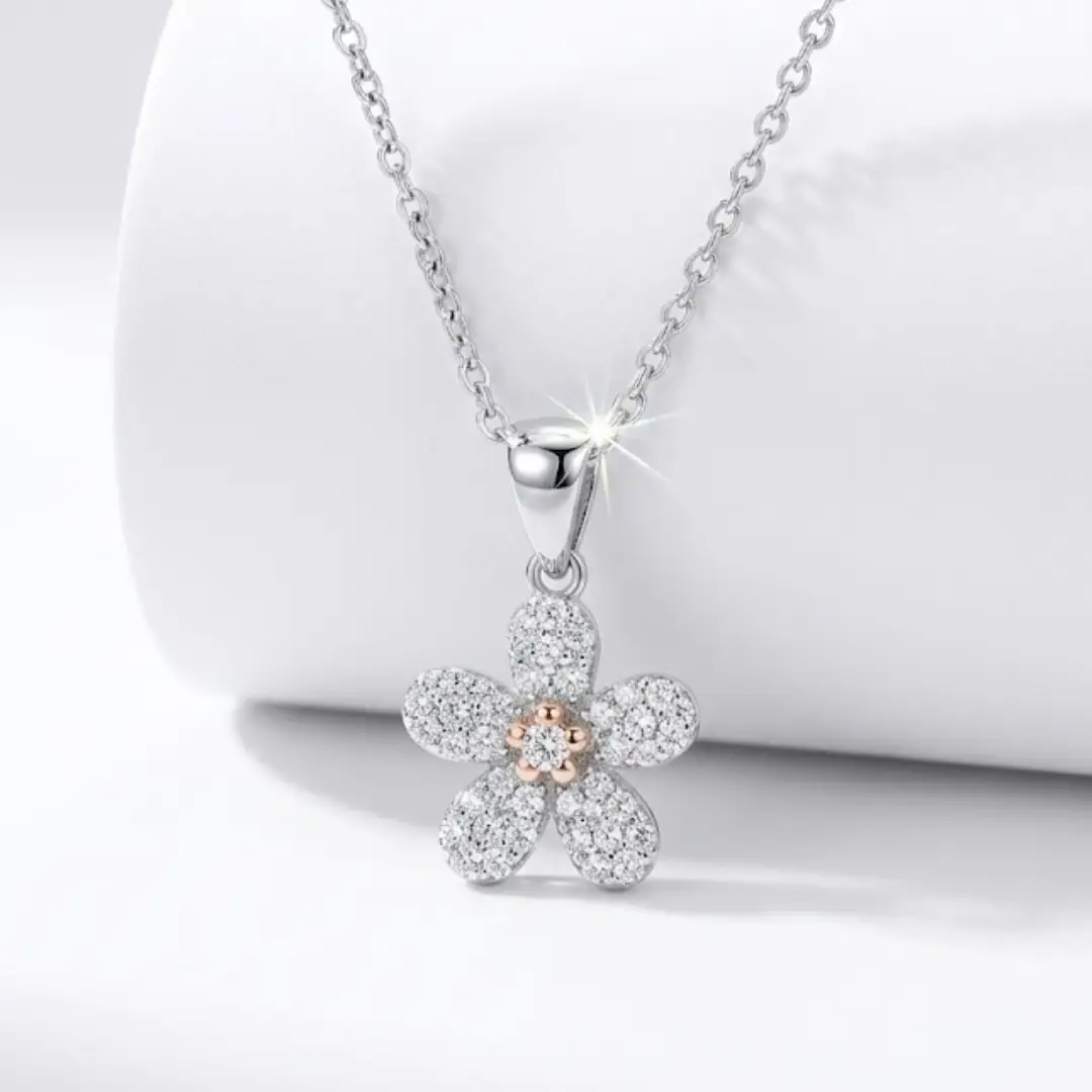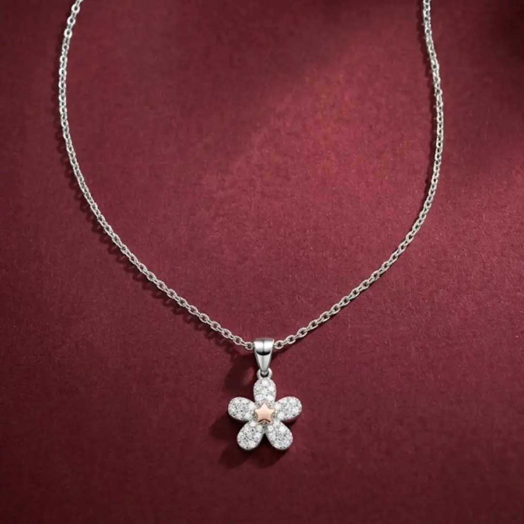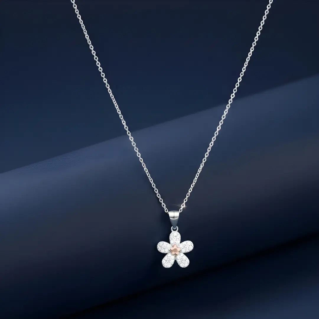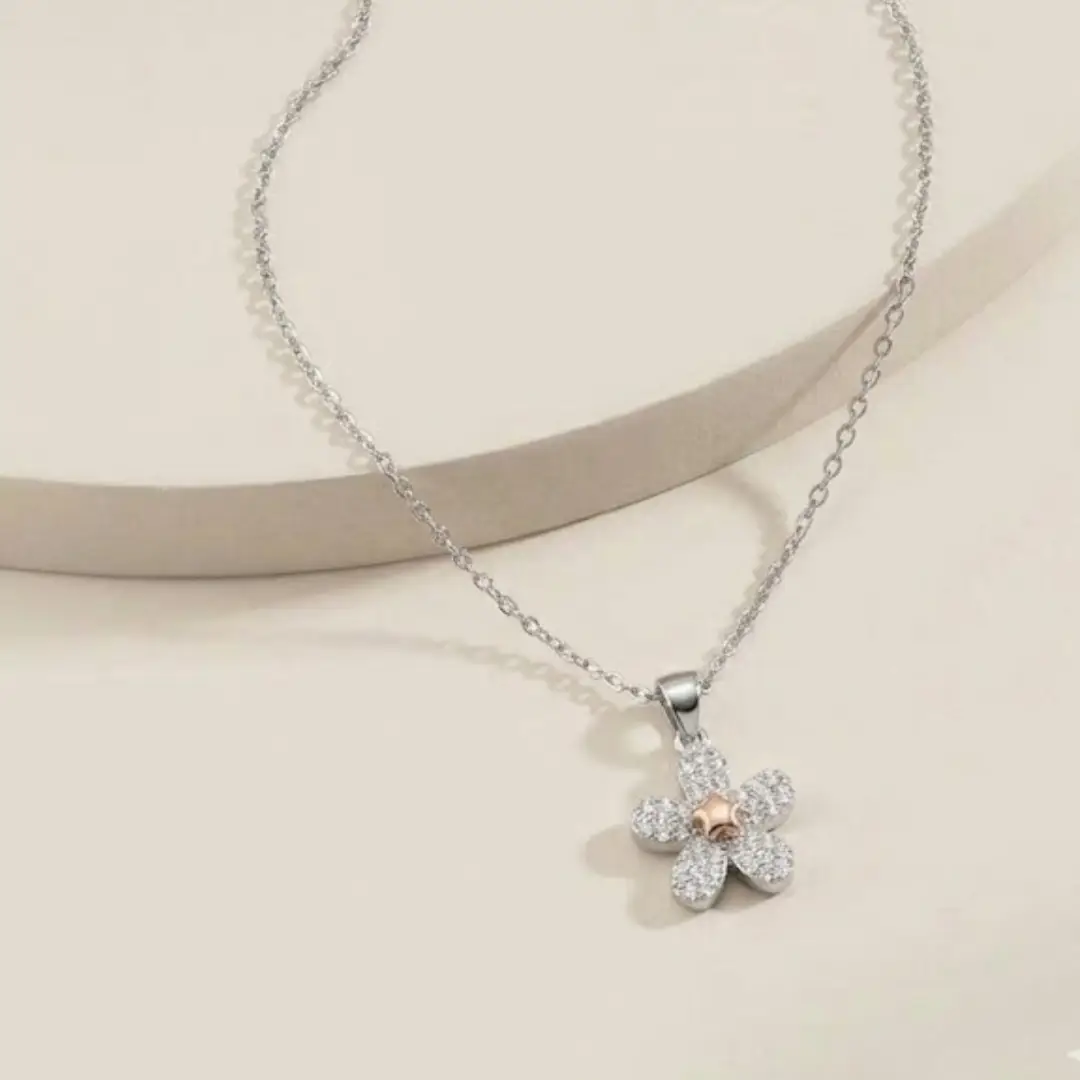 Add a touch of blooming beauty to your style with this sparkling flower pendant necklace. Crafted with a silver-tone setting and adorned with clear crystal pavé petals, this charming five-petal flower features a rose gold-tone center, adding warmth and contrast. Perfect for spring-inspired looks or as a gift to brighten someone’s day.