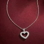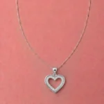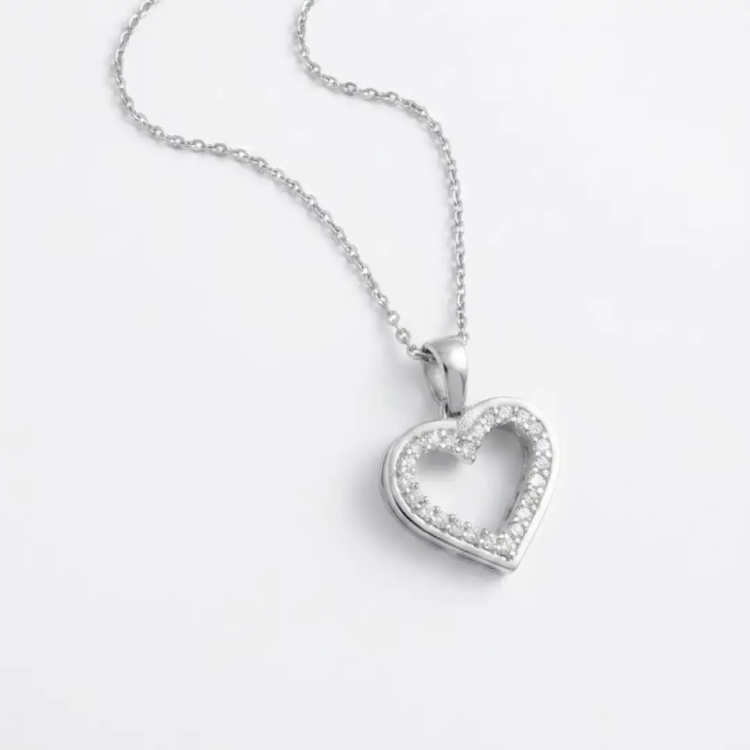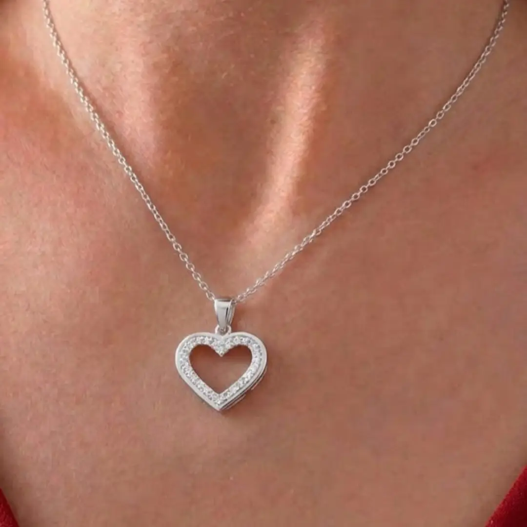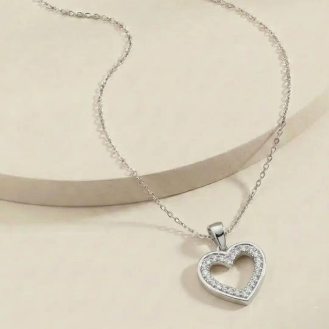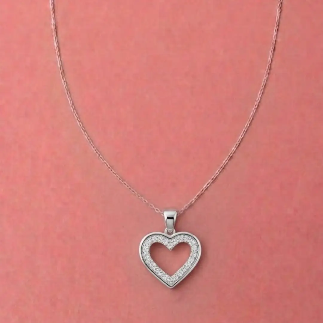 This beautiful necklace features a heart-shaped open pendant, elegantly outlined with a row of sparkling clear stones. Suspended from a dainty silver-tone chain, the design combines classic romance with modern elegance. Its shimmering accents make it a perfect gift to express love, appreciation, or simply to add a touch of sparkle to any outfit.