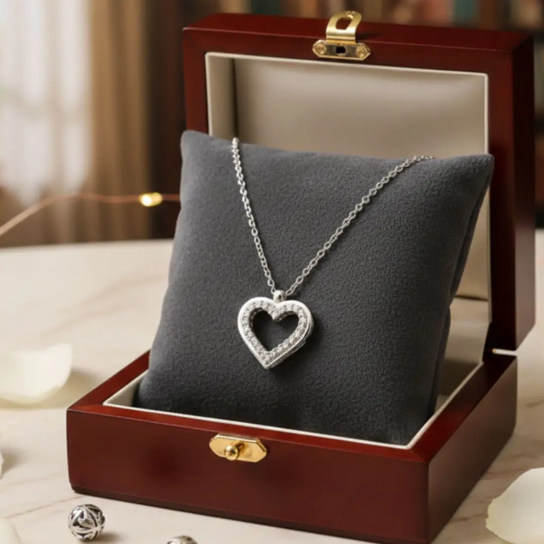 Stone Accents: Clear, round-cut stones (likely cubic zirconia or crystals) along the inner edge of the heart