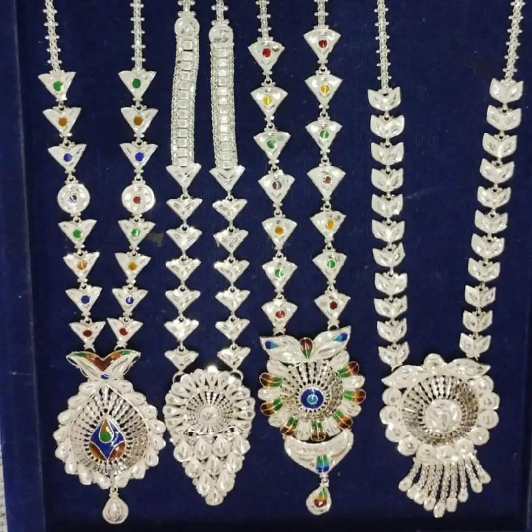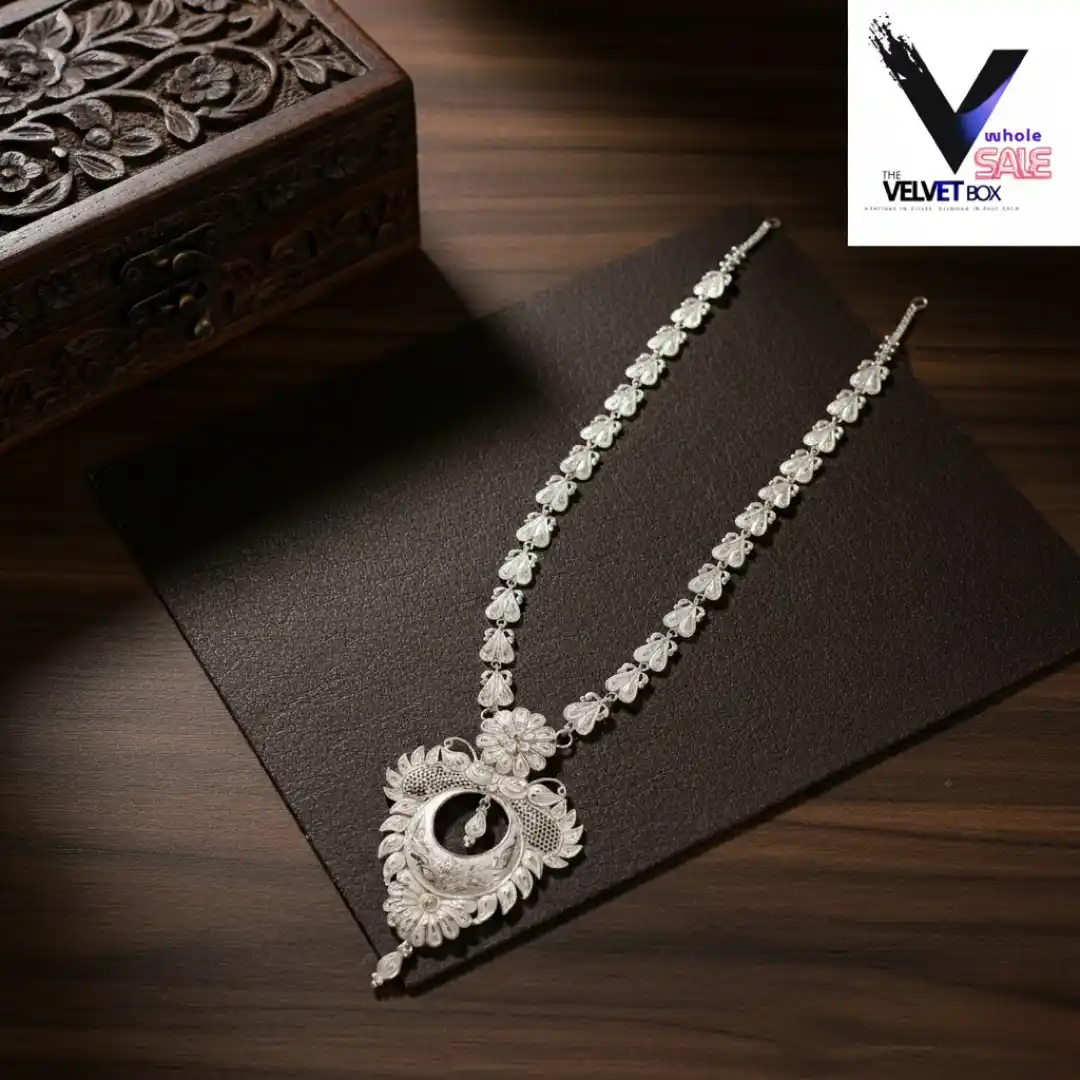 This elegant necklace is crafted in 925 sterling silver, featuring a beautifully detailed peacock motif pendant suspended from a delicate floral-pattern link chain. The intricate design reflects traditional Indian artistry, making it perfect for festive occasions, weddings, and ethnic wear.