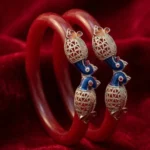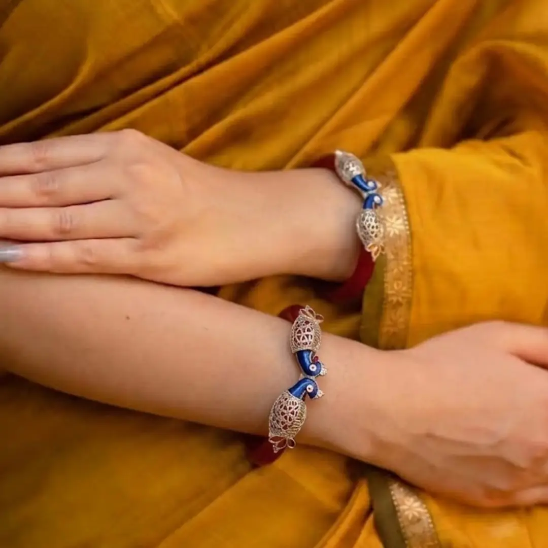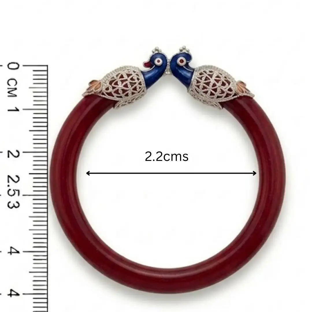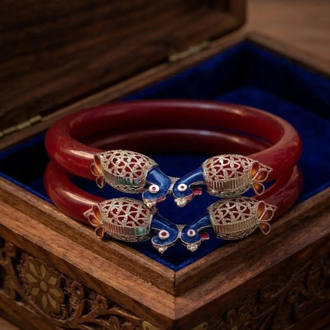 - Design: High-gloss red Pola base with double peacock “Mukh” caps, featuring vibrant blue enamel and filigree silver work.
