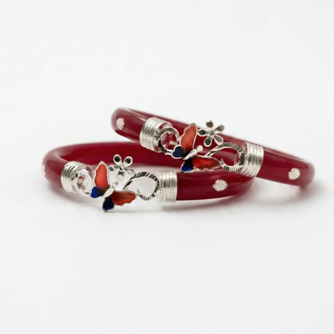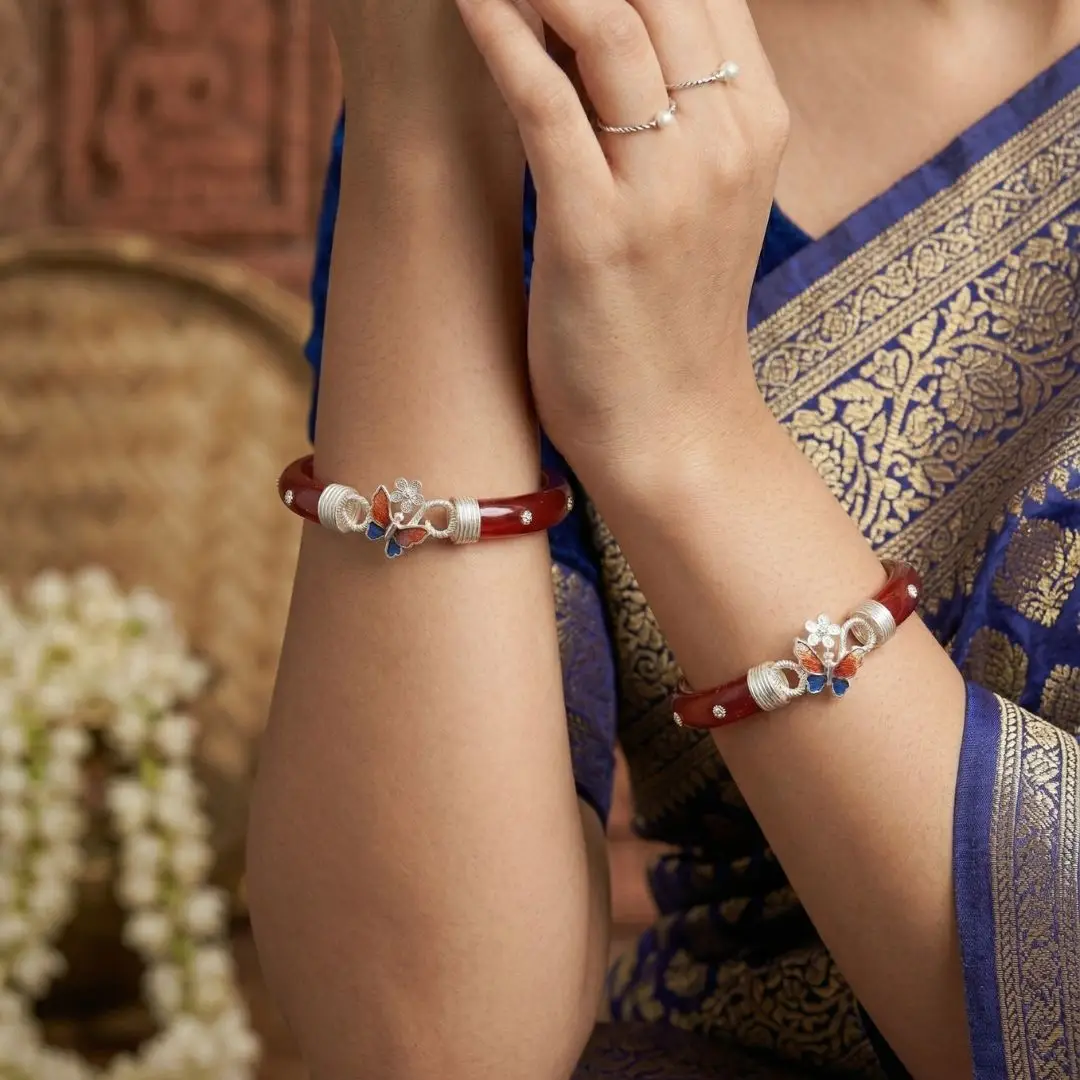 Elevate your traditional attire with a touch of modern elegance. This 925 Silver Pola Bangle by The Velvet Box is a perfect blend of Bengali heritage and contemporary jewelry design. Handcrafted with precision, the vibrant red pola is beautifully accented with high-quality silver work featuring a delicate butterfly and floral motif.