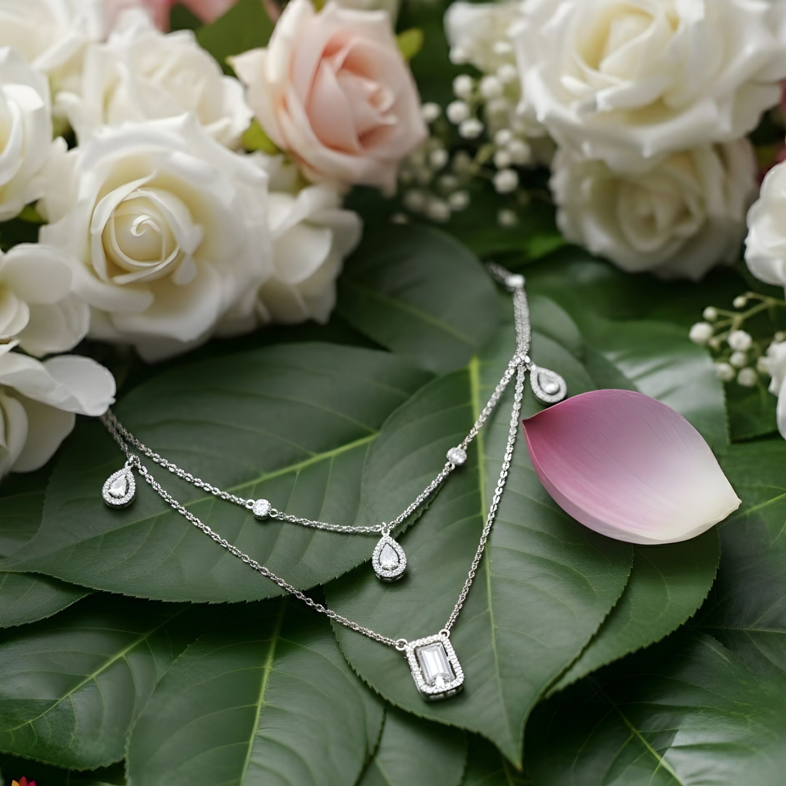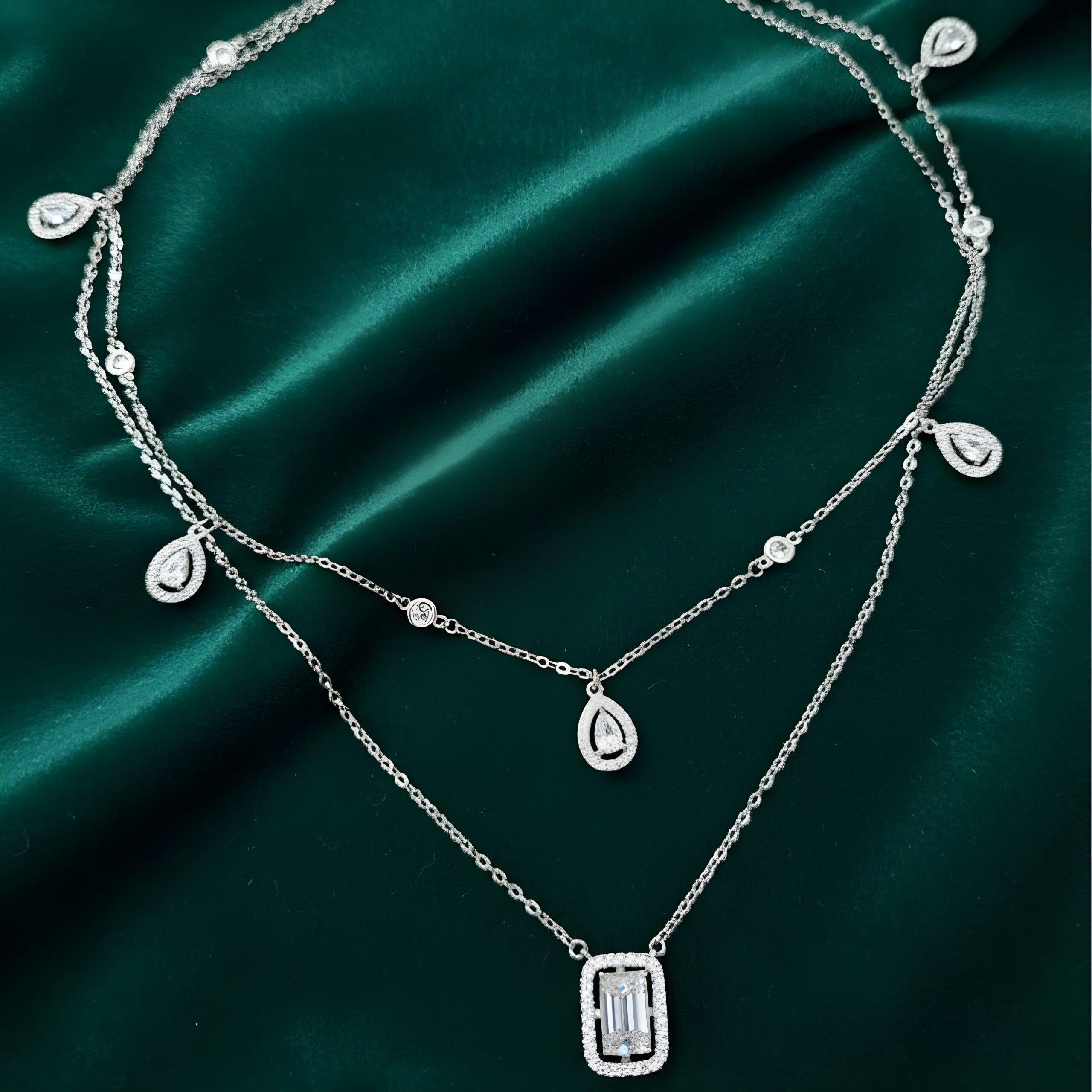 Shine with sophistication wearing this Layered 925 Silver Necklace, featuring dual chains adorned with sparkling teardrop charms and a stunning rectangular pendant. Crafted from genuine sterling silver and finished with high-quality cubic zirconia stones, this necklace adds a modern yet timeless elegance to any outfit. Perfect for parties, festive occasions, or daily glamour.
