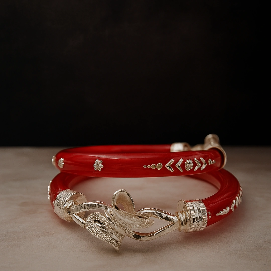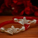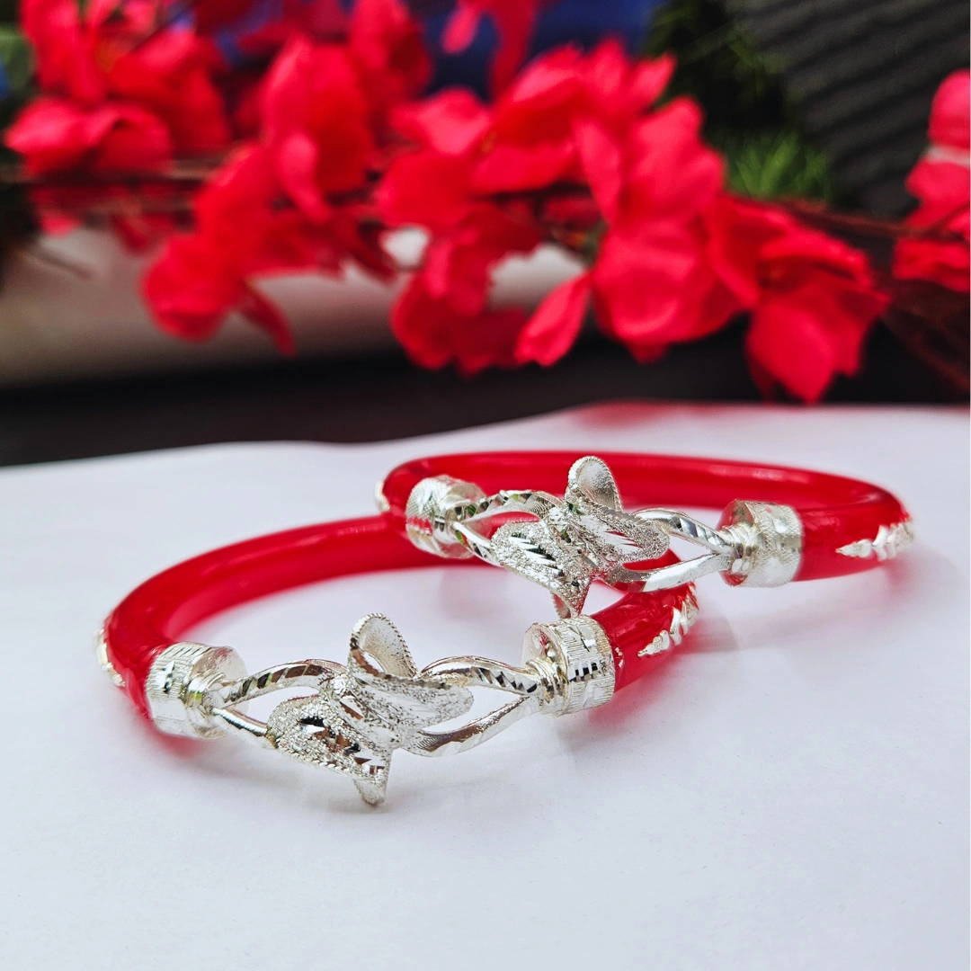 Enhance your traditional jewelry collection with this Elegant Red Silver Pola Bangle, beautifully handcrafted with a graceful silver leaf-inspired openwork design. The vibrant red body combined with finely detailed silver elements creates a perfect balance of tradition and elegance.