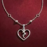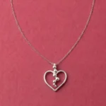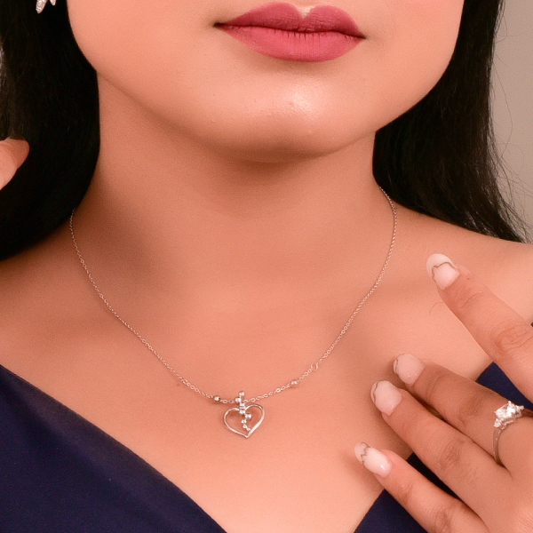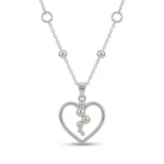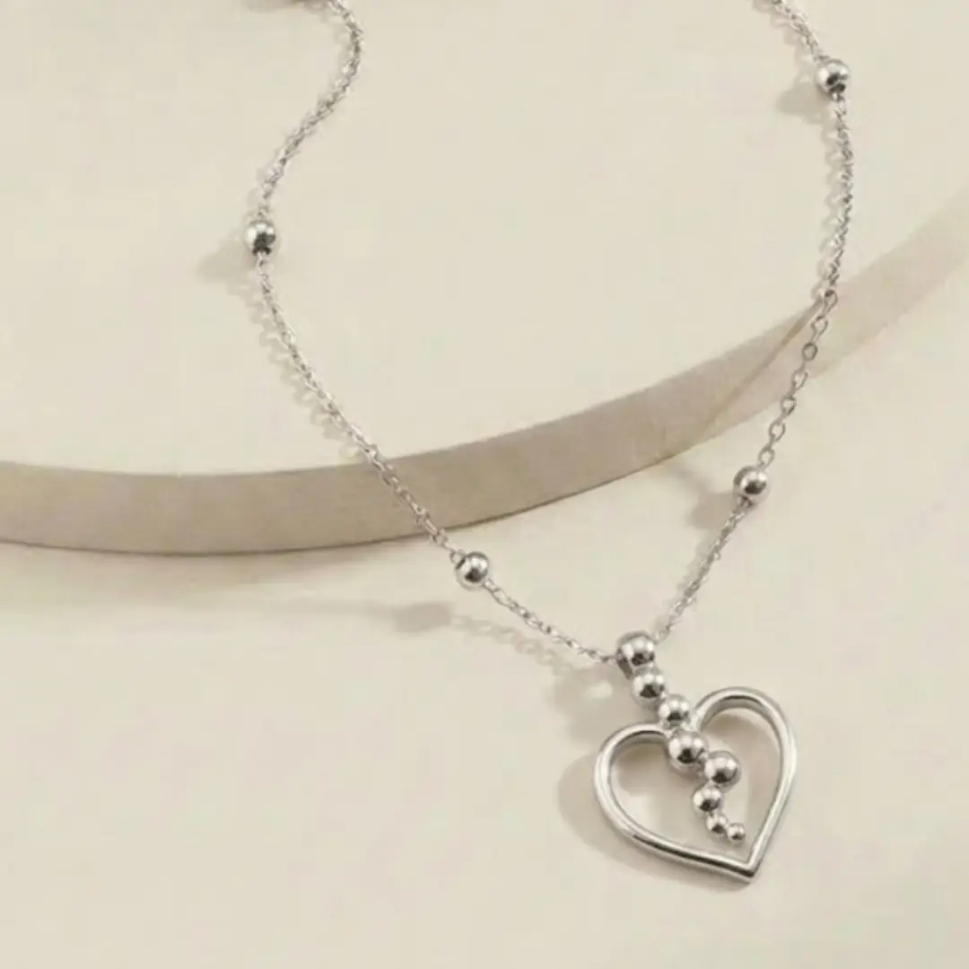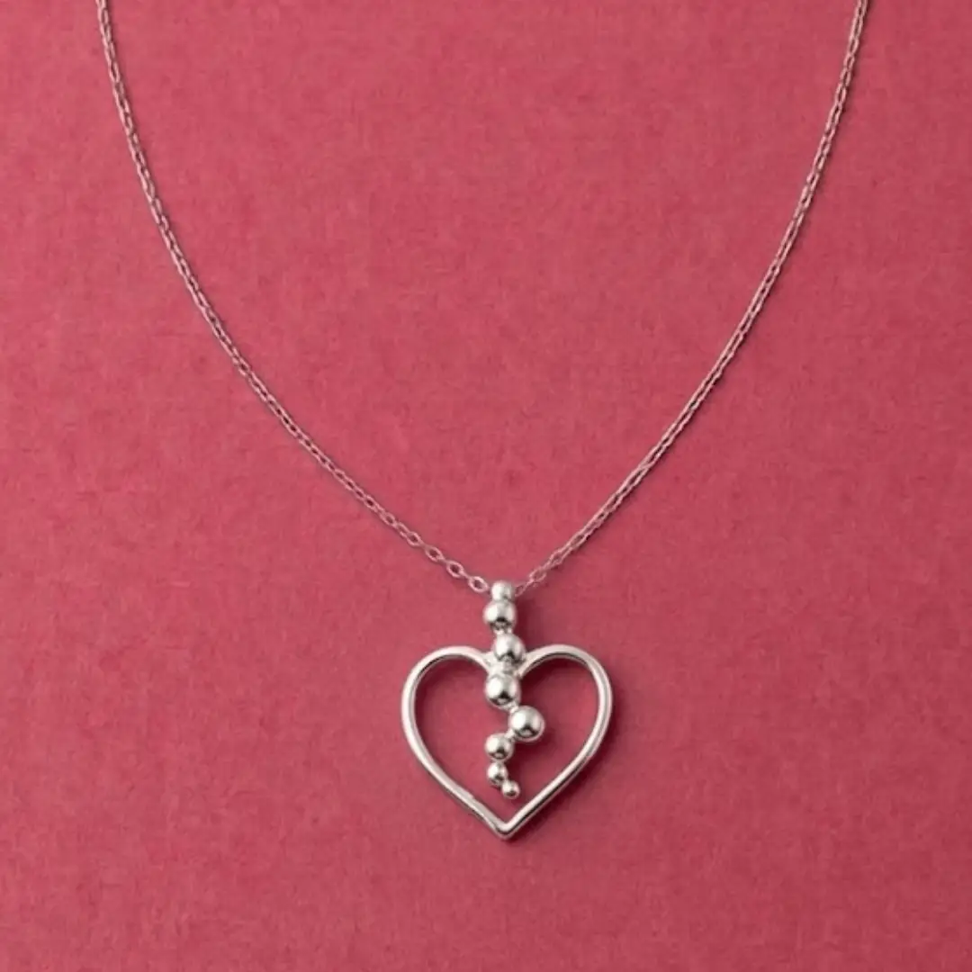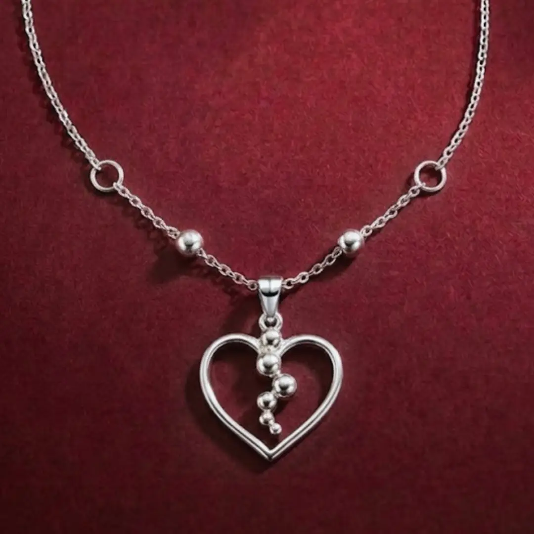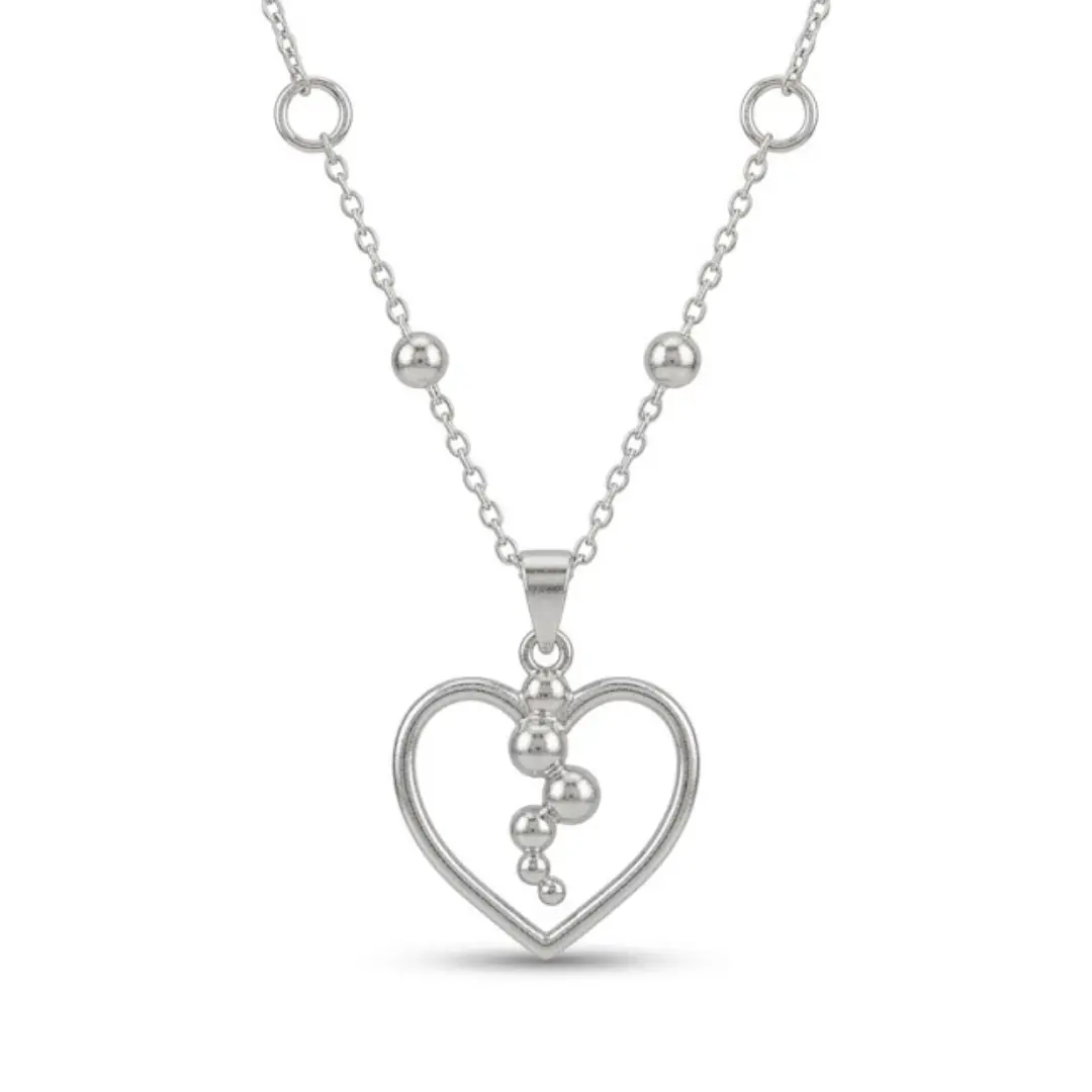 This elegant silver necklace showcases a minimalist yet modern design, featuring an open heart-shaped pendant accented with a cascading arrangement of polished silver beads. The delicate chain is adorned with small silver ball details that complement the pendant, adding a subtle touch of texture and dimension. The necklace exudes a sense of refined charm, making it perfect for both casual and special occasions. Its timeless heart motif symbolizes love and affection, making it an ideal gift for someone special or a meaningful addition to your own jewelry collection.