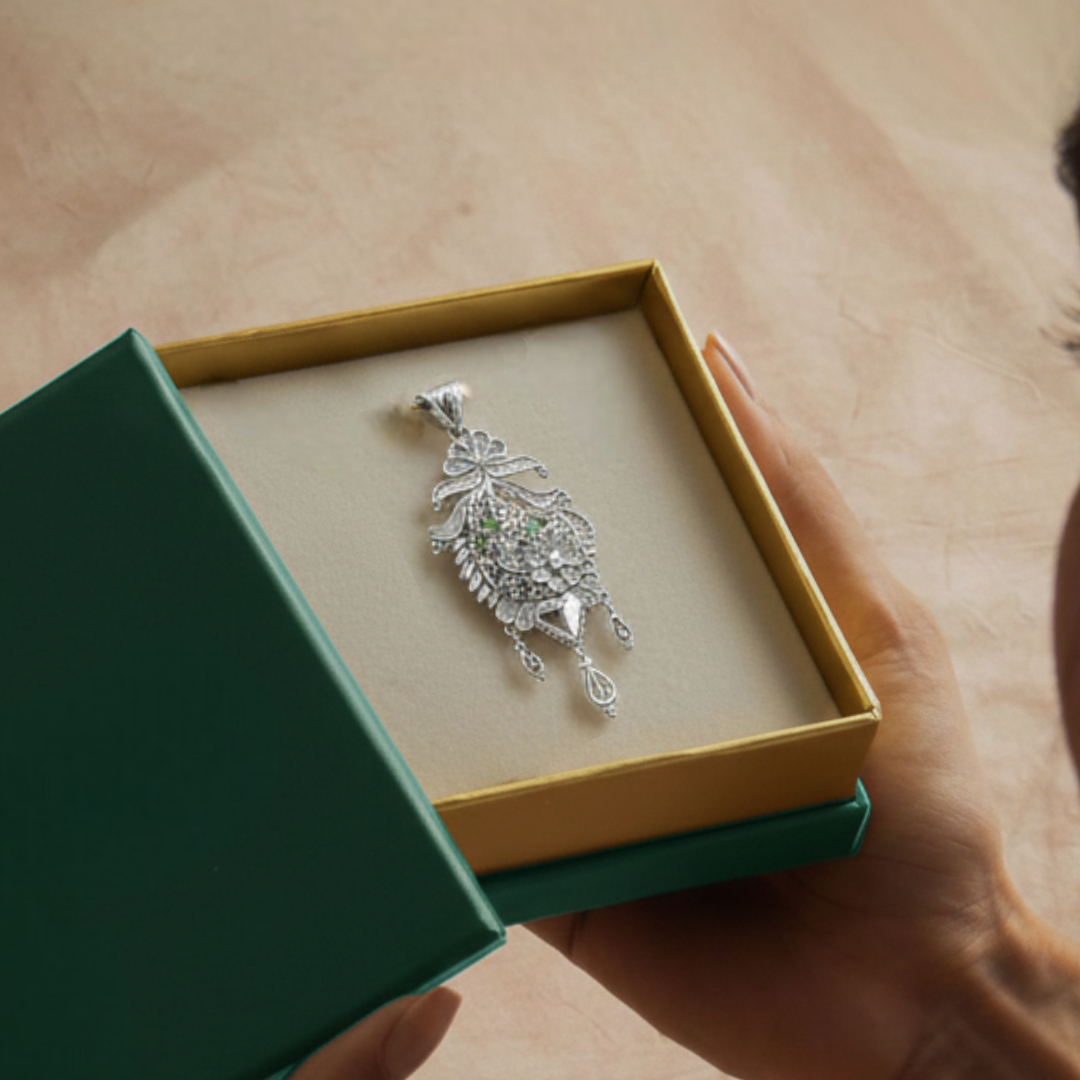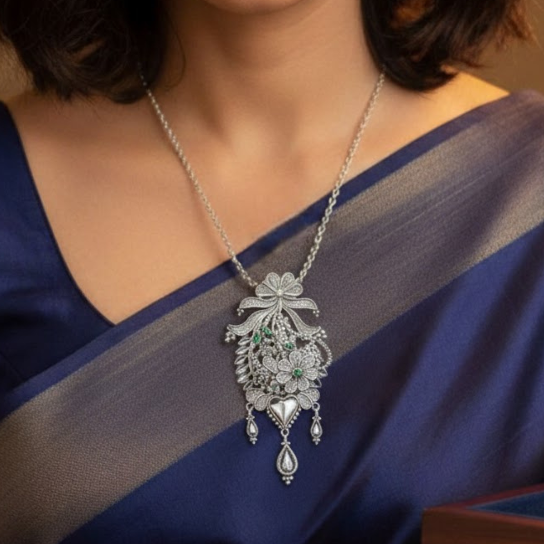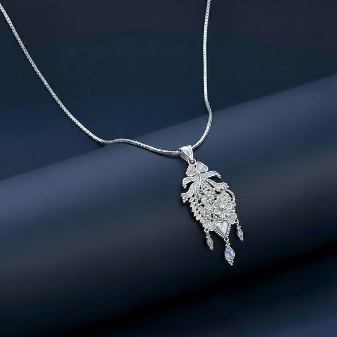 Experience pure sophistication with our Elegant Silver Pendant featuring a Floral & Heart Design. This stunning piece redefines luxury for the modern woman. As a primary highlight of our collection of stylish pendant necklaces for women, this accessory offers a delicate and romantic aesthetic. Our artisans meticulously craft each unit from premium 925 Fine Silver.