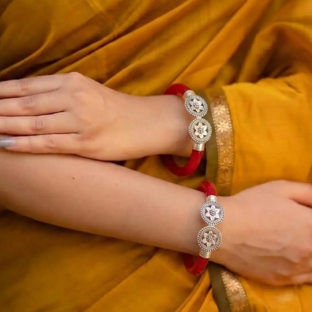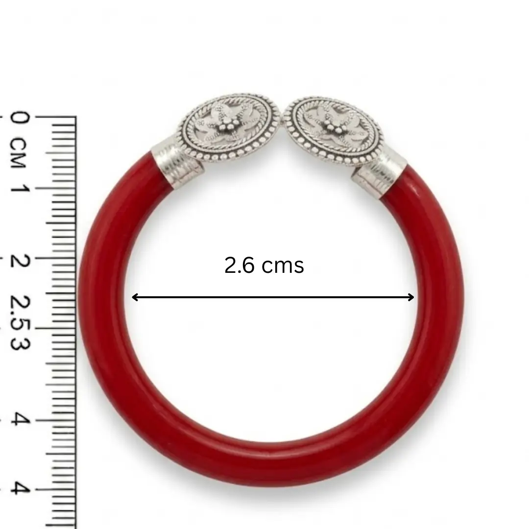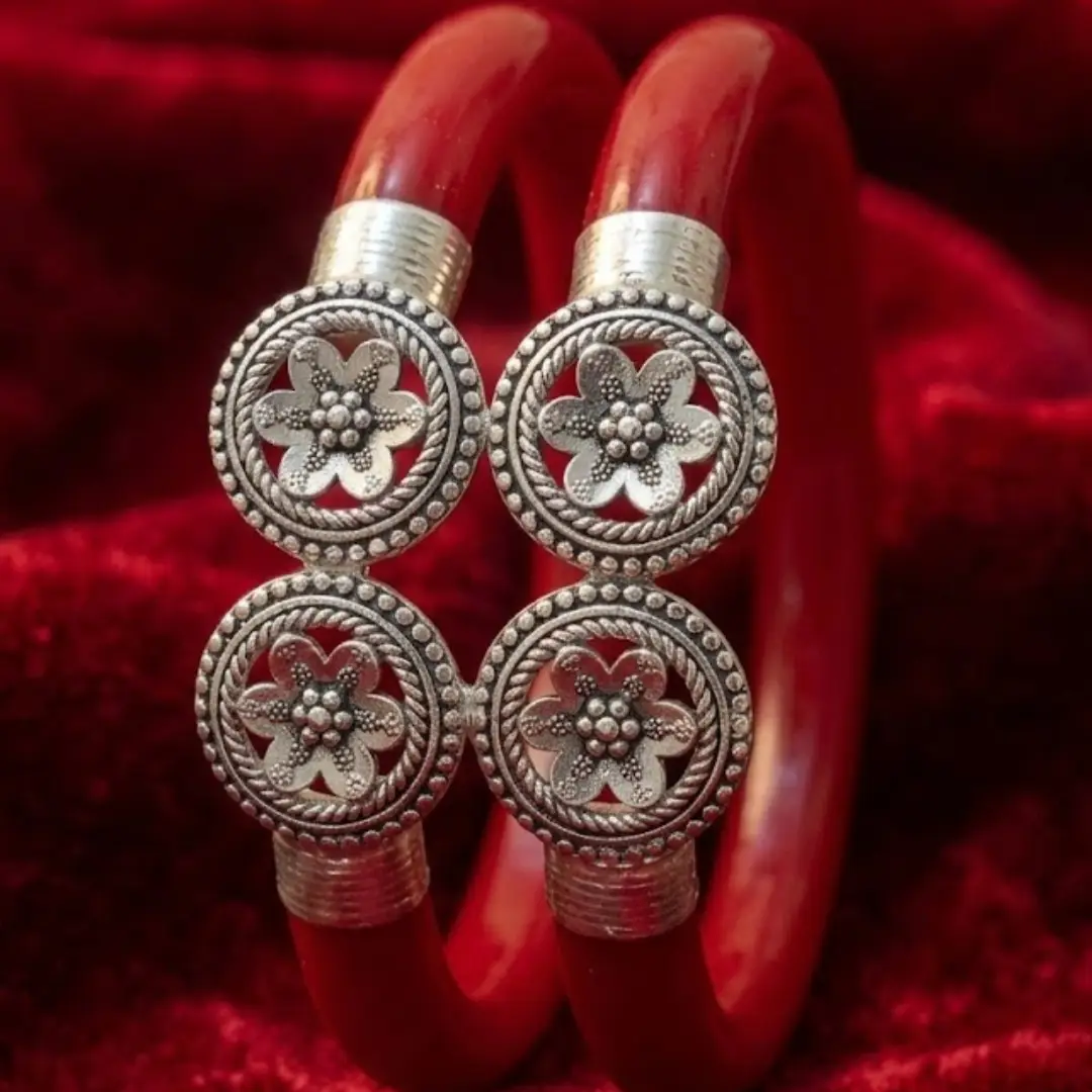 Elevate your traditional attire with our stunning 925 Silver Red Mukh Pola Bangles. This unique pair features a striking “Mukh” (open-end look) design adorned with beautifully detailed, circular mandala-style floral caps. Crafted with premium silver and high-gloss red resin, these bangles represent the perfect harmony between antique charm and modern craftsmanship.