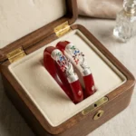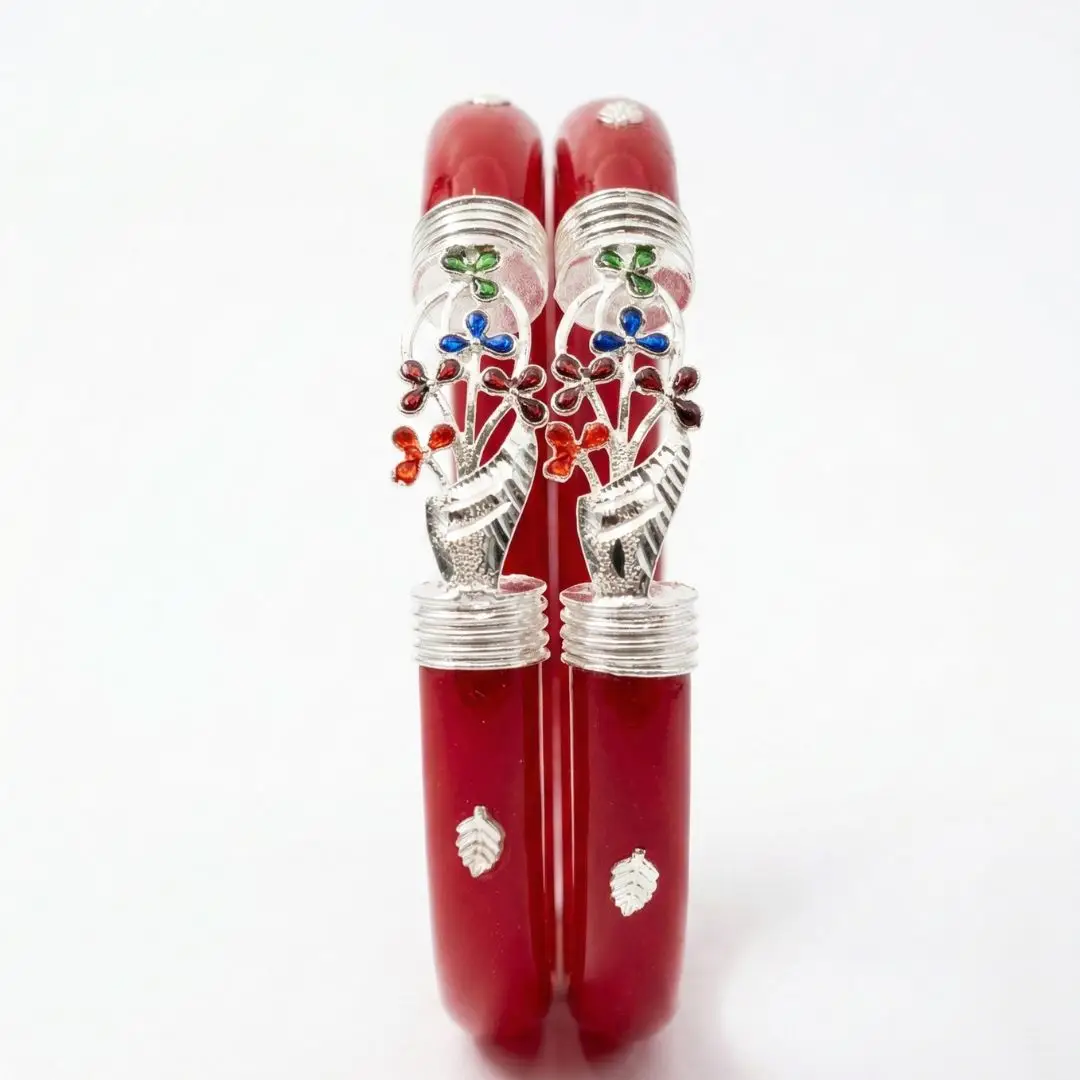 Experience the perfect blend of tradition and vibrant artistry. The Velvet Box presents this stunning 925 Sterling Silver Pola Bangle, featuring a unique floral design. The rich red base is beautifully complemented by intricate silver wrapping and a centerpiece of multicolor enamel (Meenakari) flowers, adding a pop of color to your ethnic ensemble.