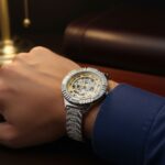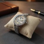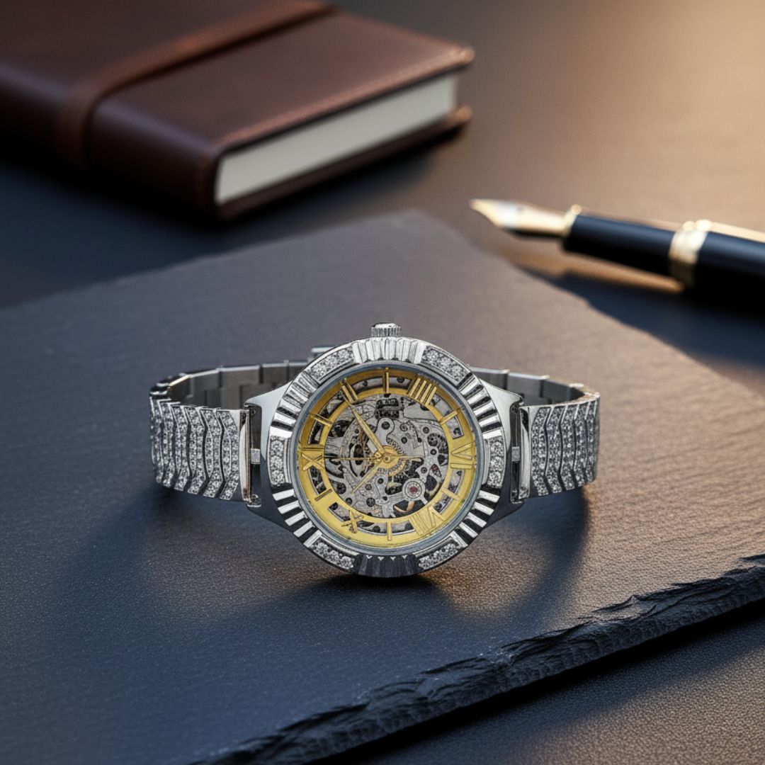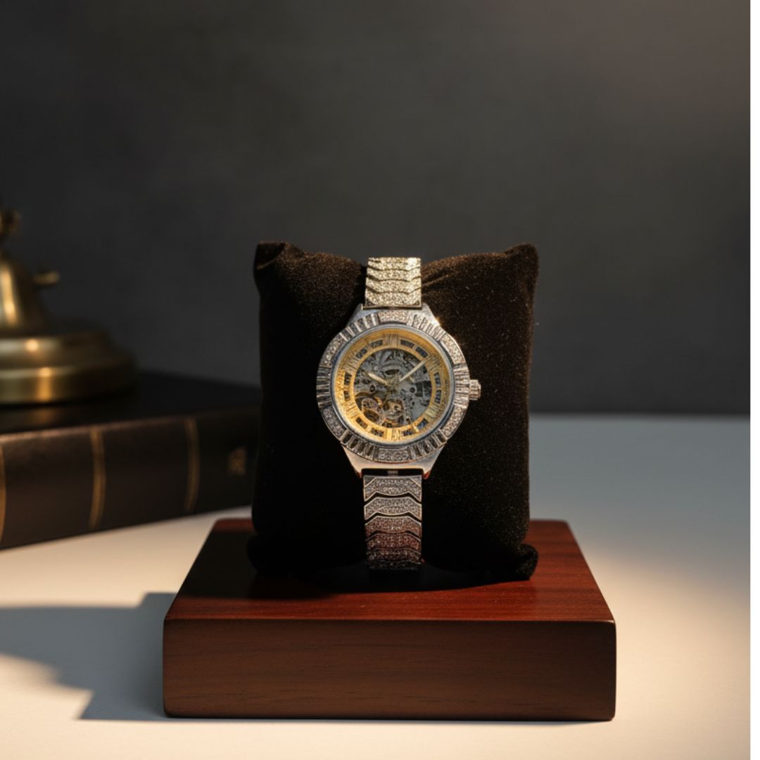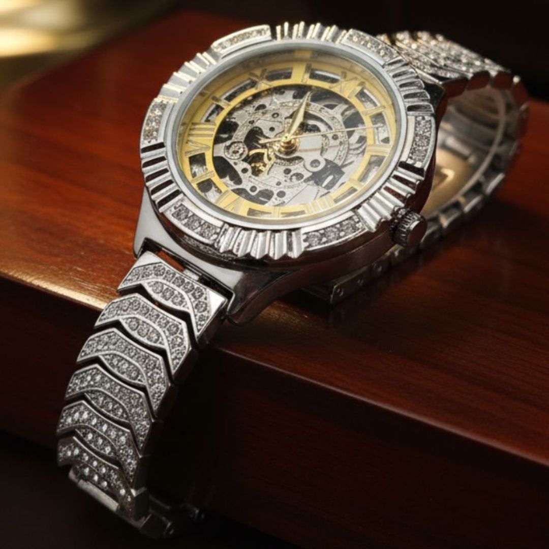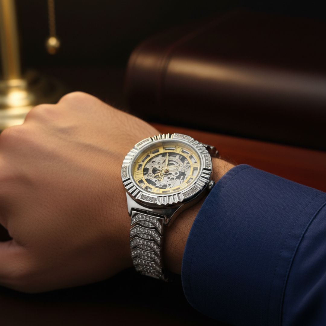 Elevate your style with this Luxury Skeleton Dial 925 Silver Men’s Bracelet Watch, a perfect blend of craftsmanship and sophistication. Expertly designed with a solid 925 sterling silver body and band, this timepiece showcases a skeleton dial that reveals the intricate inner mechanics, reflecting true horological artistry. The diamond-studded bracelet design adds a regal shine, while the gold-tone accents on the dial enhance its luxurious appeal.
