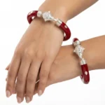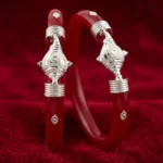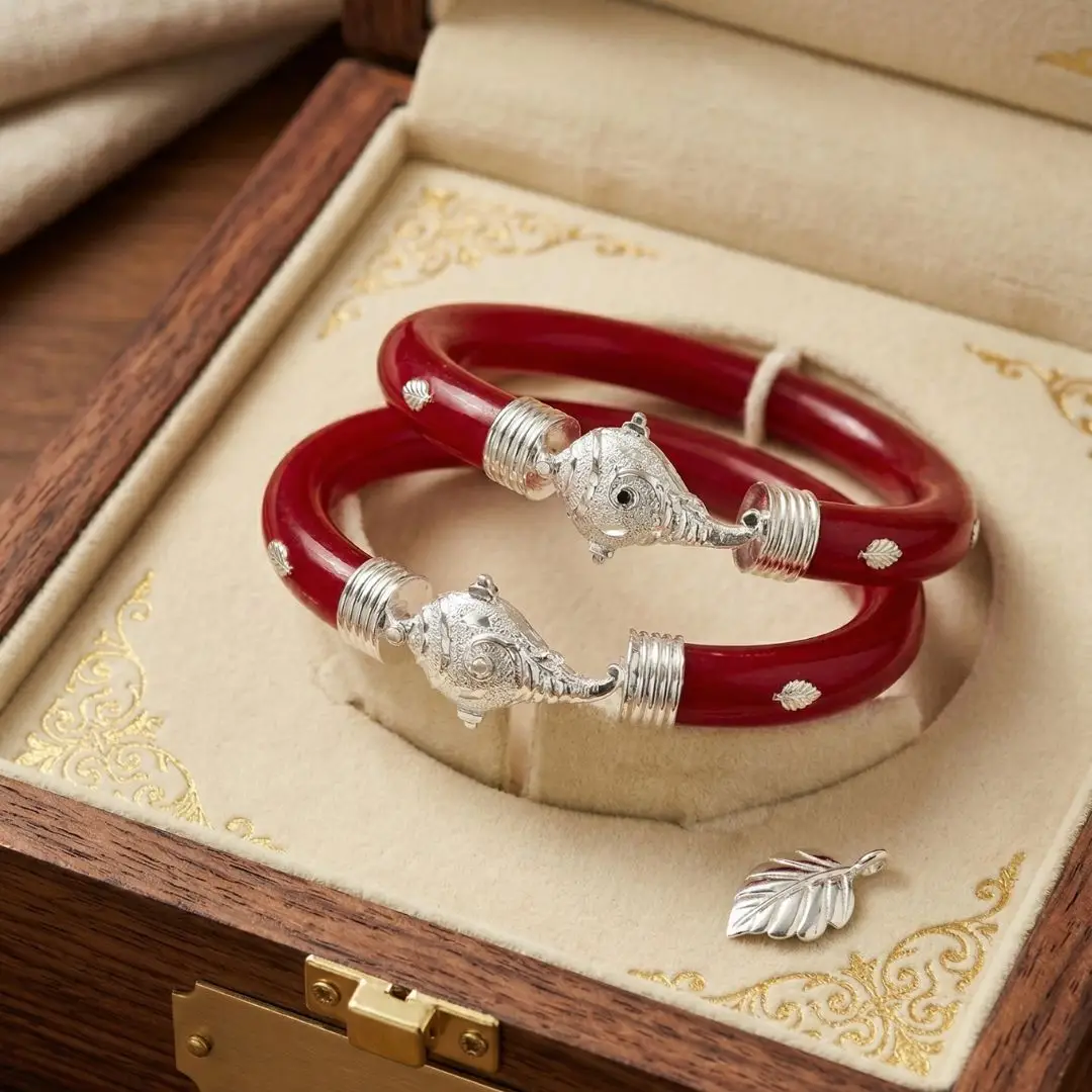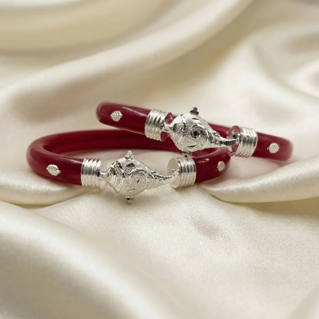 Elevate your traditional attire with a touch of heritage and strength. This 925 Silver Pola Bangle by The Velvet Box is a perfect blend of Bengali culture and sophisticated craftsmanship. Handcrafted with precision, the vibrant red pola is beautifully accented with high-quality silver work featuring a majestic Elephant (Gajraj) motif and delicate leaf detailing.