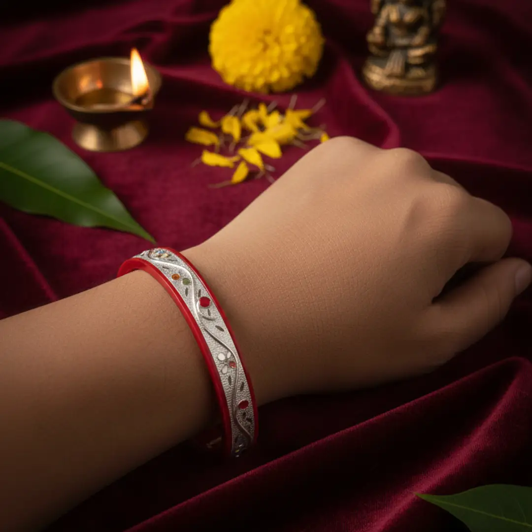 At The VelvetBox, we provide the silver noya design with price transparency for all our premium silver collections. As a result, this traditional accessory has become a favorite for those seeking the vibrancy of “Sabeki” art with 925 silver reliability. Therefore, we crafted this Silver Vine Pola Bangle with a focus on both cultural heritage and premium aesthetics. Enhance your jewelry box today with this artistic vine-themed silver set. Finally, enjoy the enduring beauty and radiant glow of our colorful ethnic collection on your most special occasions.