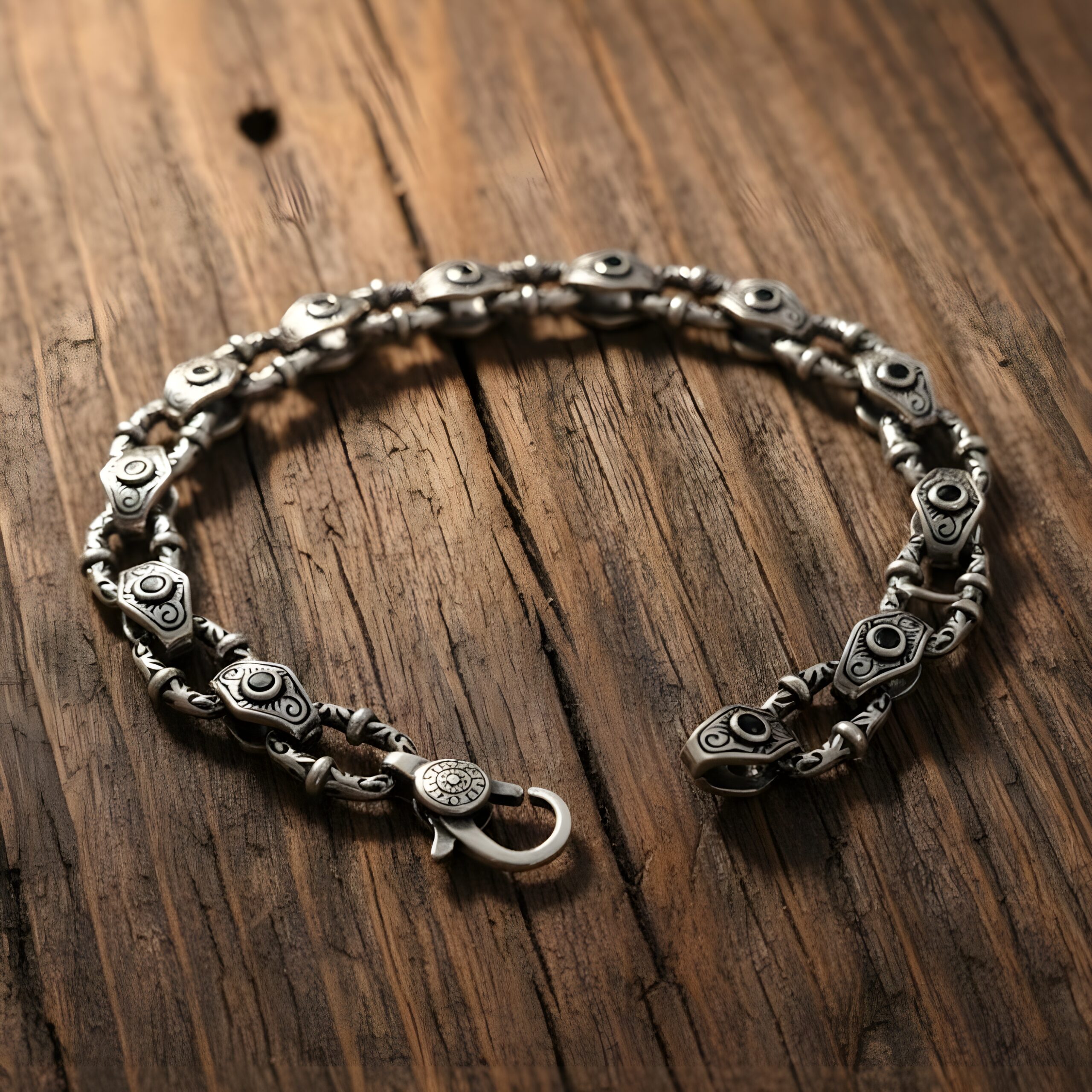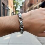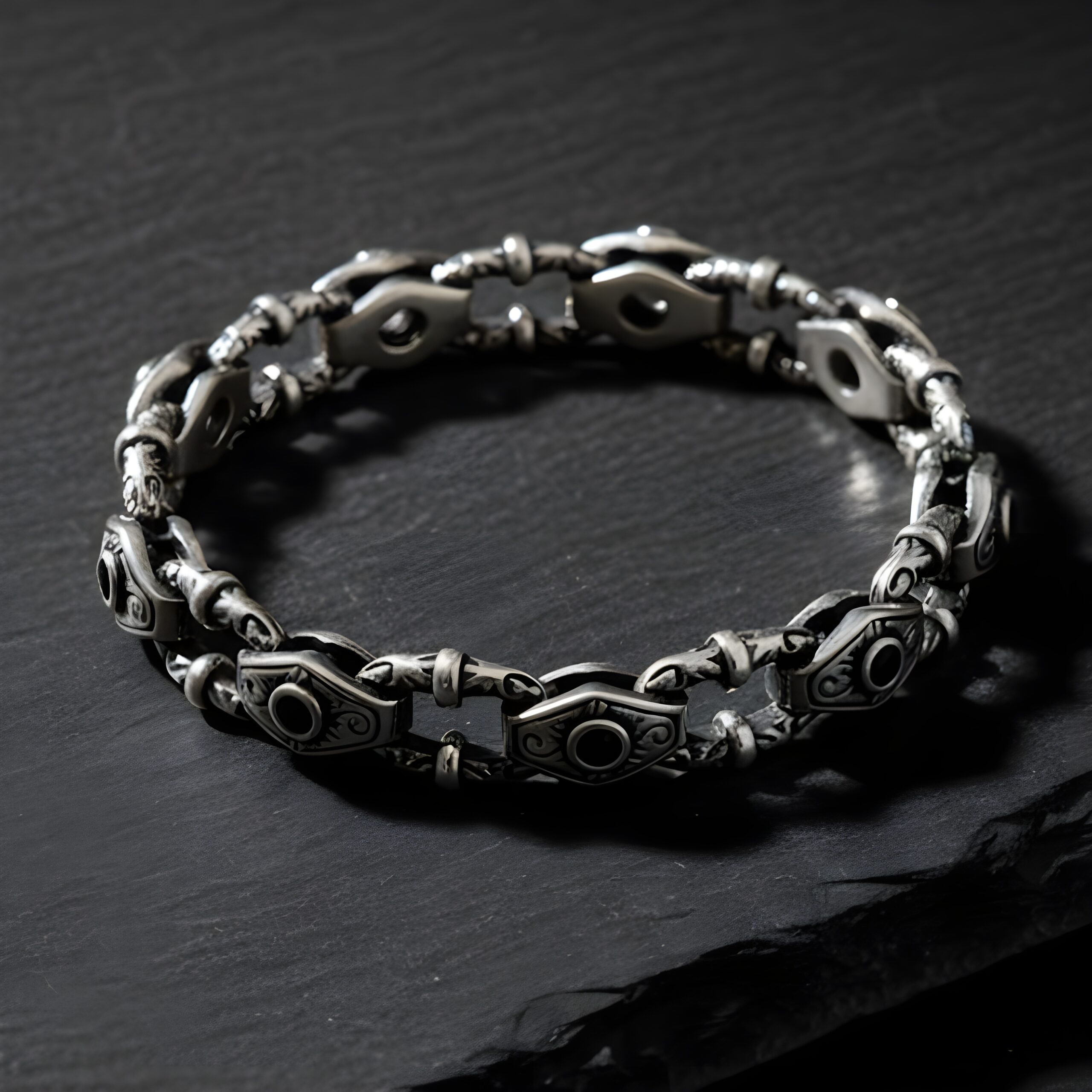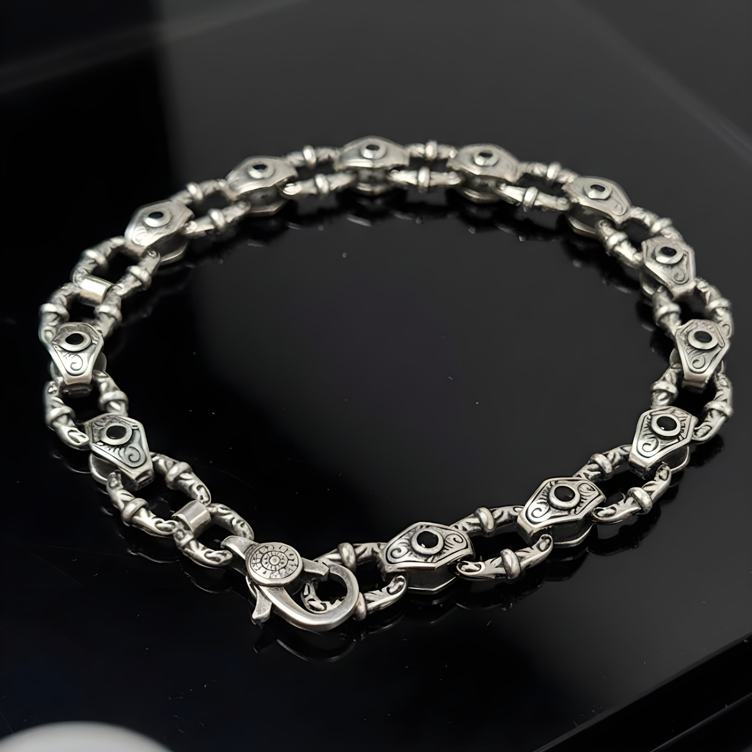 The deep black hue of onyx symbolizes power and protection, while the ornate silver detailing adds a regal, timeless touch. Perfect for men who appreciate fine artistry and confident style, this bracelet transitions seamlessly from formal events to casual outings.