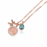 - Design: Circular pendant with crystal accents, a teardrop gemstone, and an additional charm.
