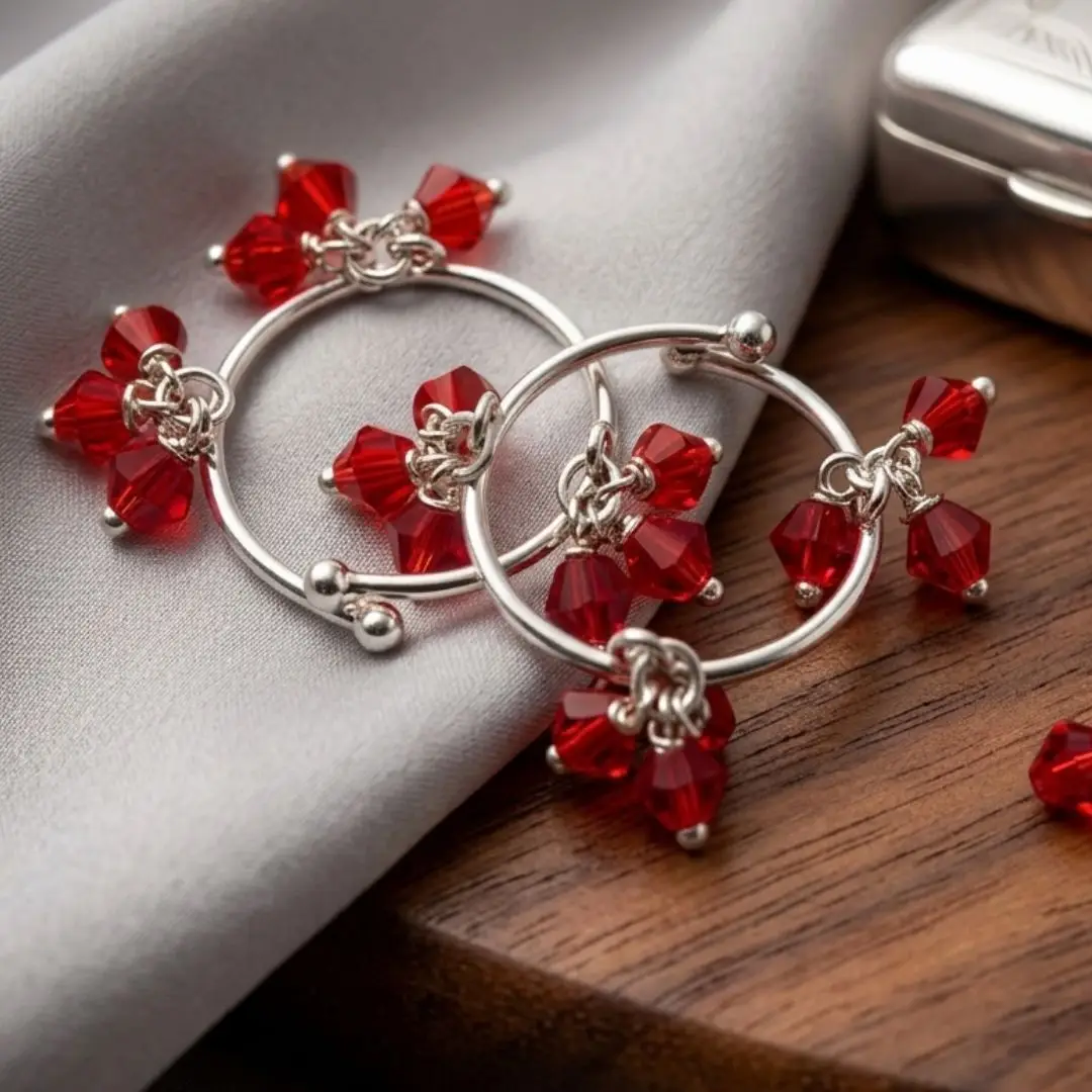 Elevate the shringar of your beloved Thakur ji with this exquisite 925 Silver Laddu Gopal Anklet. Handcrafted with precision, these anklets feature vibrant red crystal beads intricately woven into high-quality silver rings. Designed specifically for the delicate feet of Laddu Gopal, these payals add a divine charm and a melodious presence to your deity’s attire.