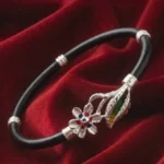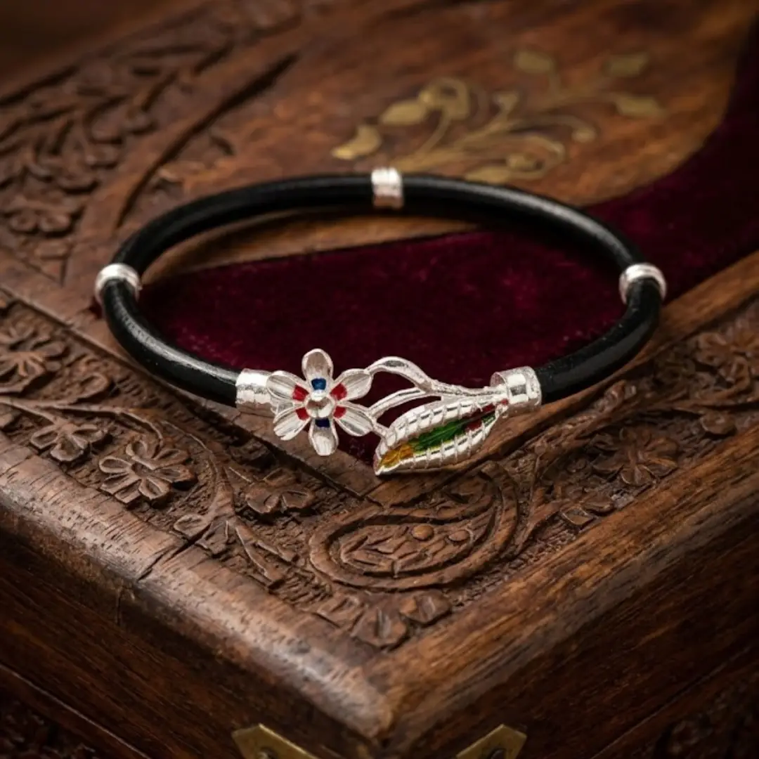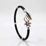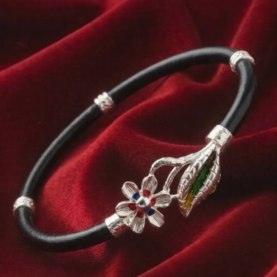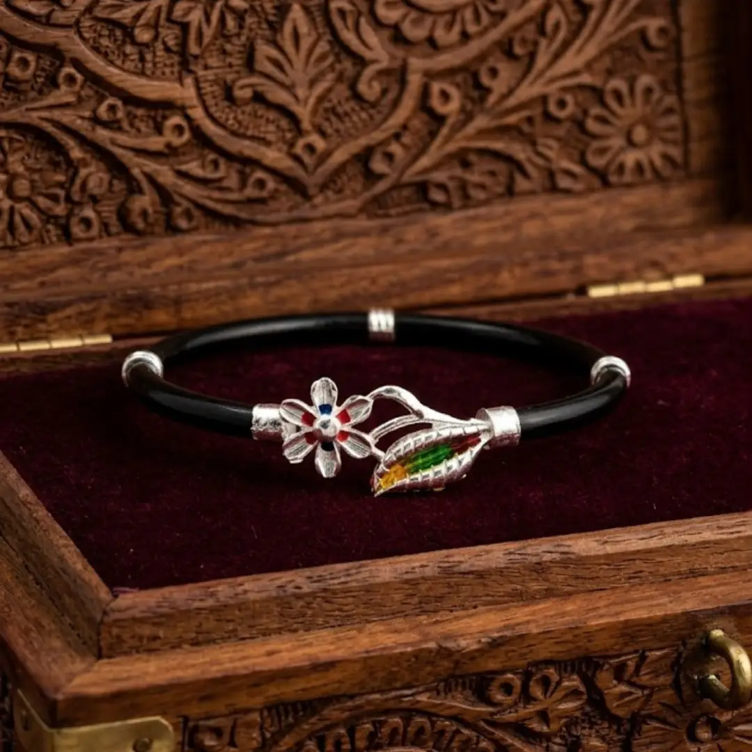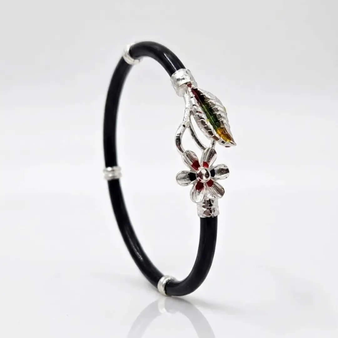 This Noya bangle features a stunning Silver Leaf and Flower motif with delicate enamel accents, making it uniquely attractive. Crafted with a premium high-quality black base and pure silver work, it is perfect for both daily wear and special occasions.