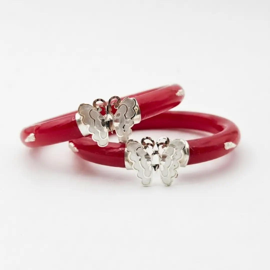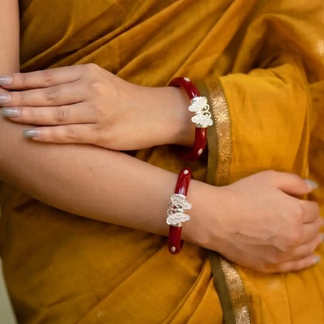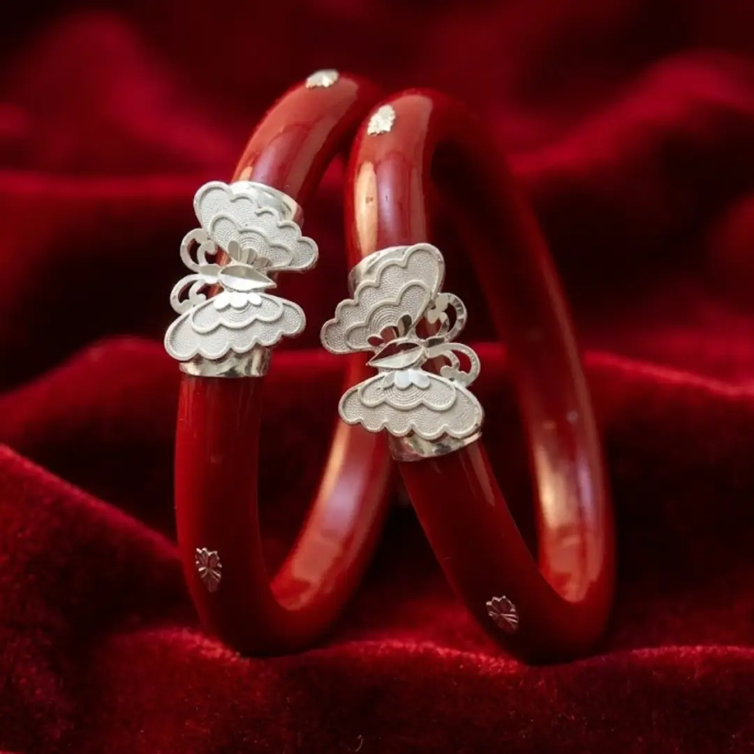 Add a touch of grace to your jewelry collection with our 925 Silver Pola Bangle. This exquisite design features a finely detailed butterfly and wing motif, expertly handcrafted in high-grade silver and mounted on a rich, traditional red pola base. The intricate silver work captures the delicate beauty of nature, making it a perfect statement piece for modern and traditional attire alike.