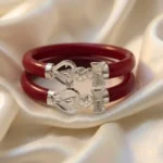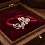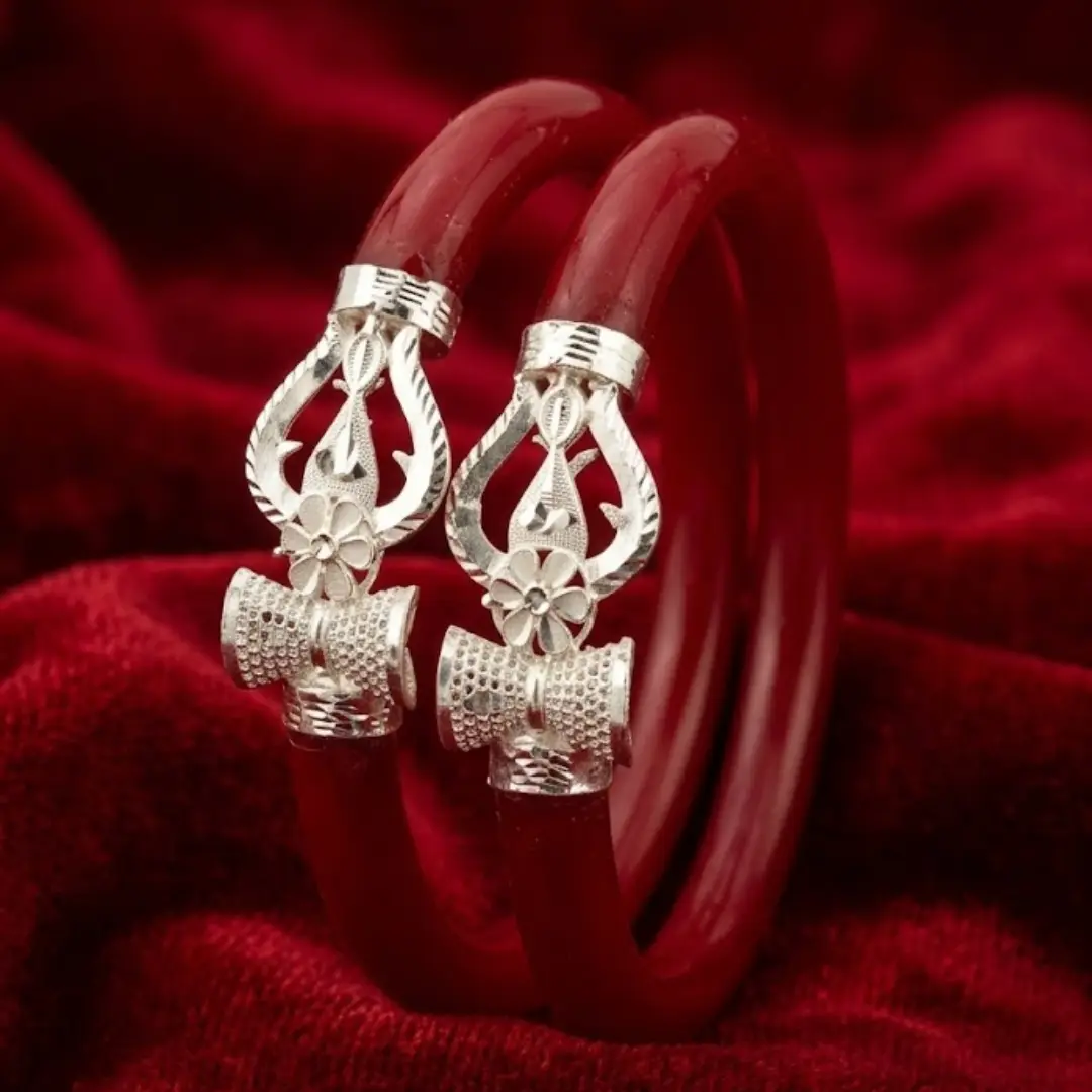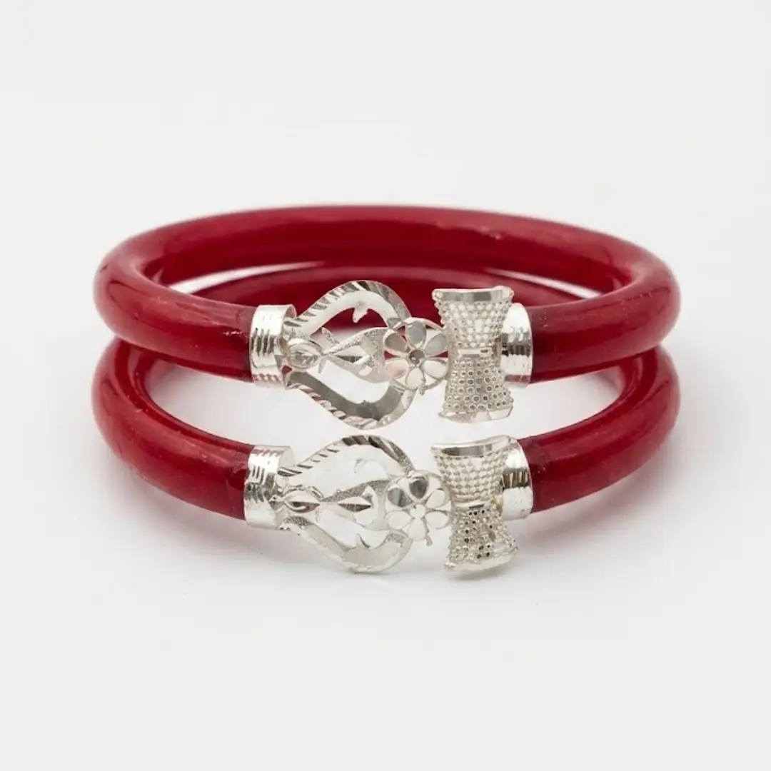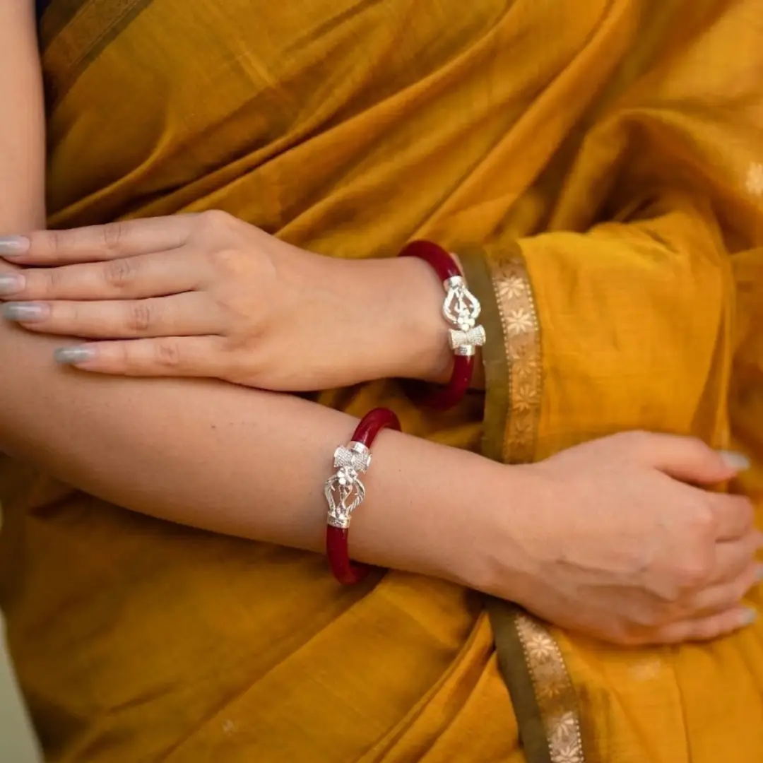Embrace spiritual elegance with our latest 925 Silver Pola Bangle. This unique design showcases the sacred symbols of the Trishul and Damru, beautifully integrated with a floral base. Handcrafted with precision, the fine silver work is mounted on a high-quality red pola, creating a powerful style statement that blends devotion with tradition.