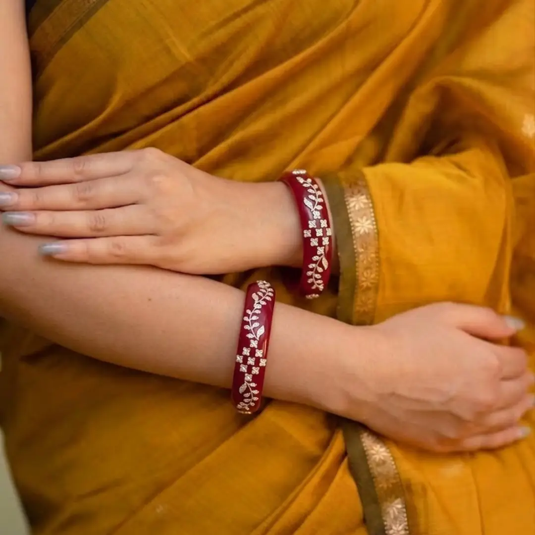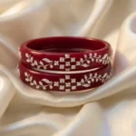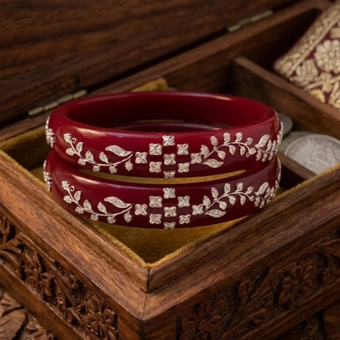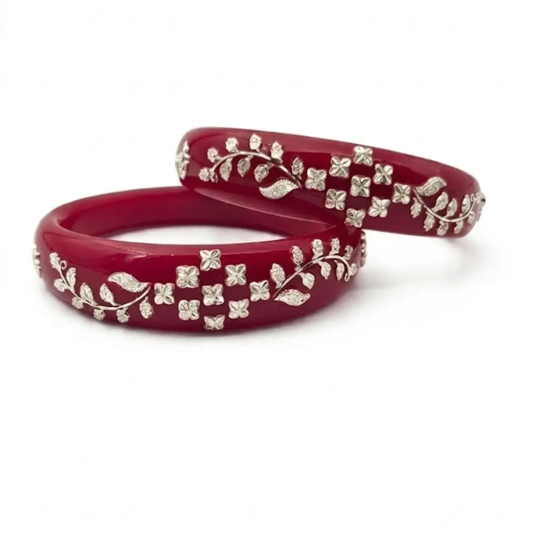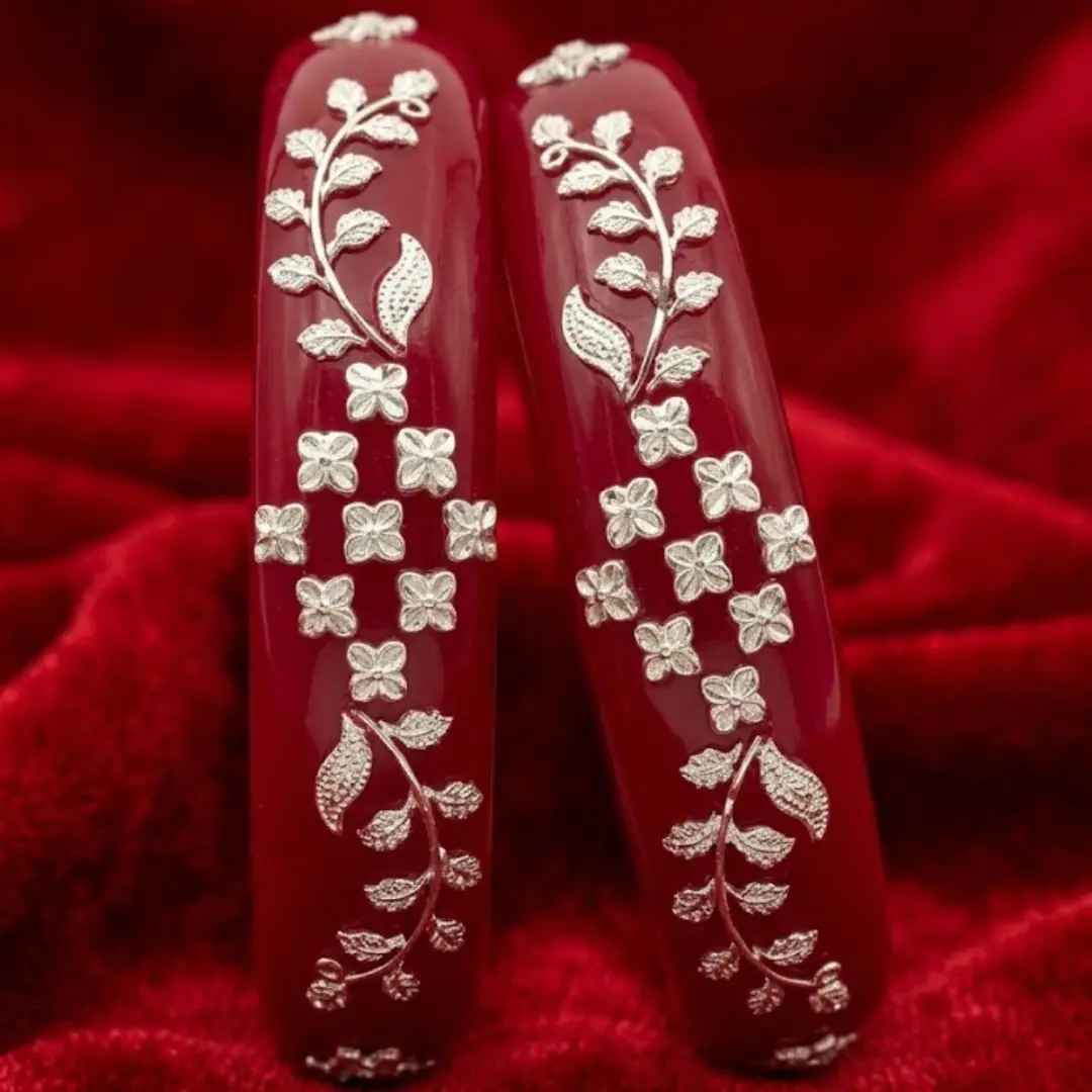 Celebrate exquisite craftsmanship with our latest 925 Silver Pola Bangle. This sophisticated design features a stunning central Floral Mesh centerpiece flanked by delicate Leaf Motifs, all meticulously handcrafted in high-polished 925 sterling silver. Mounted on a premium, deep red pola base, this bangle offers a timeless look that perfectly bridges the gap between ethnic tradition and modern luxury.