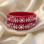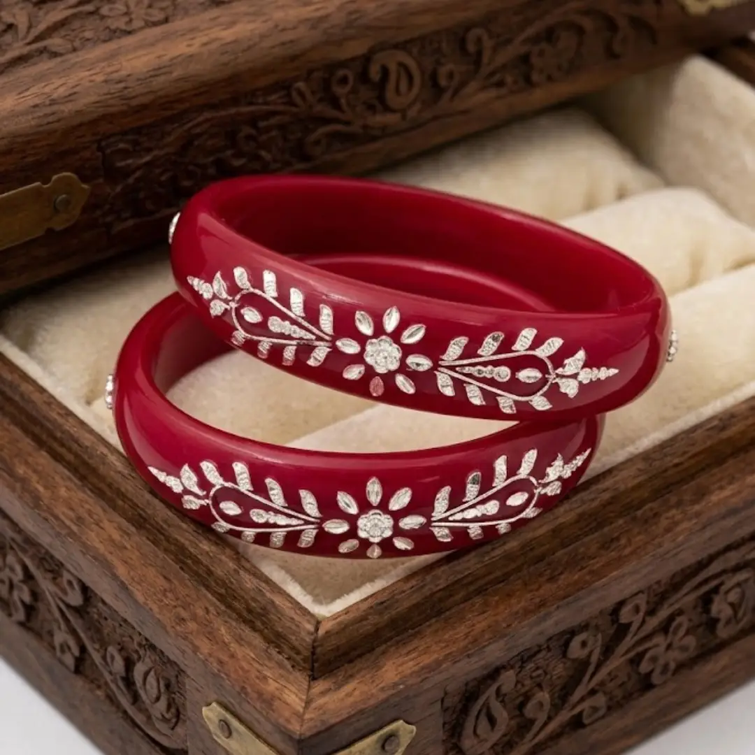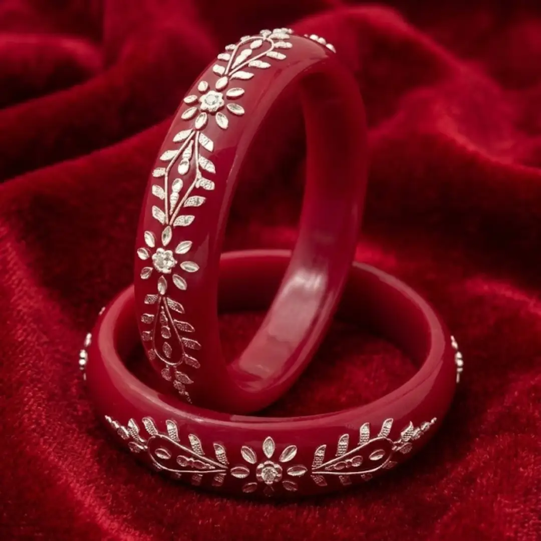 Celebrate timeless beauty with our exquisitely crafted 925 Silver Pola Bangle. This classic design features a stunning Floral and Vine motif, meticulously handcrafted with high-polished silver accents that wrap gracefully around a premium, deep red pola base. It is a perfect representation of traditional Indian craftsmanship meeting modern silver luxury.