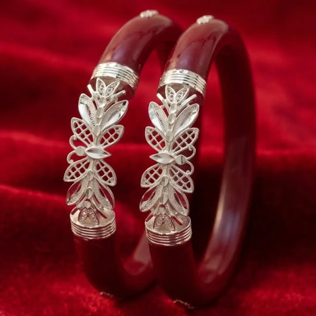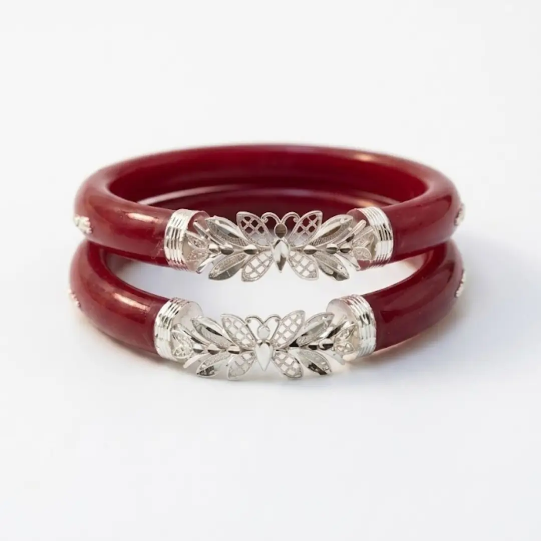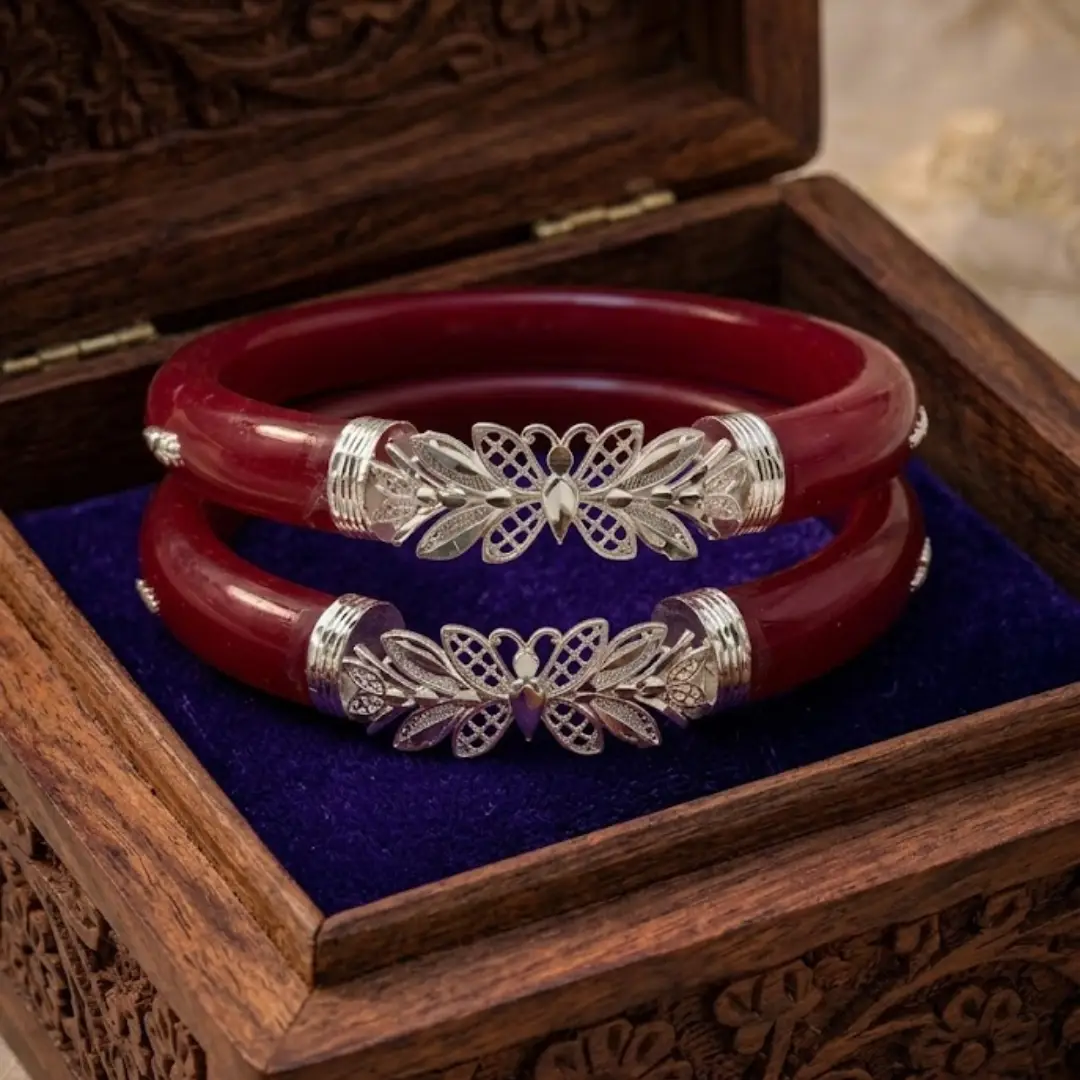 Experience the ultimate blend of traditional charm and artisanal luxury with our 925 Silver Pola Bangle. This premium design showcases a breathtaking filigree butterfly centerpiece, where the wings are crafted with delicate silver mesh and floral accents. The centerpiece is elegantly mounted on a high-quality, deep red pola base, making it an ideal accessory for bridal wear and grand celebrations.