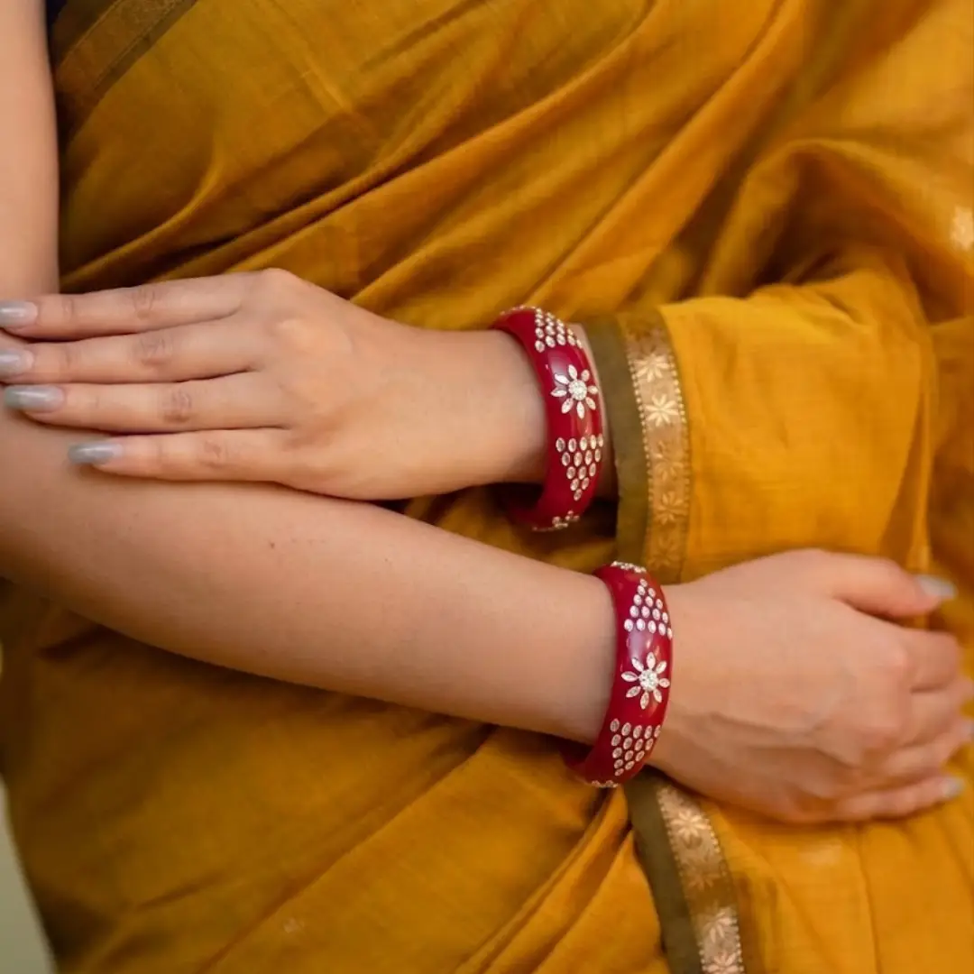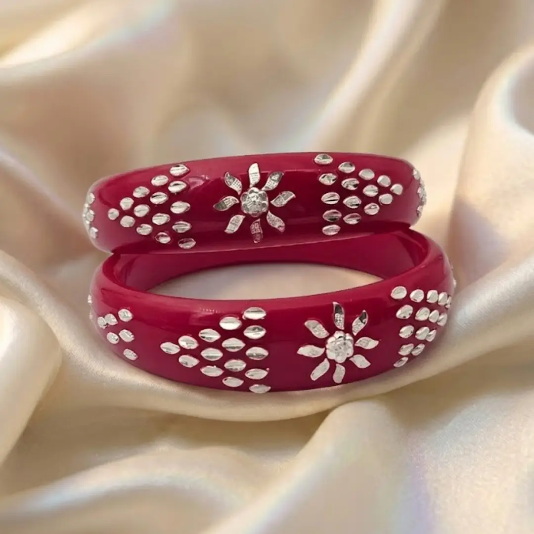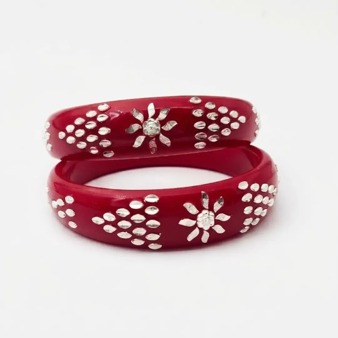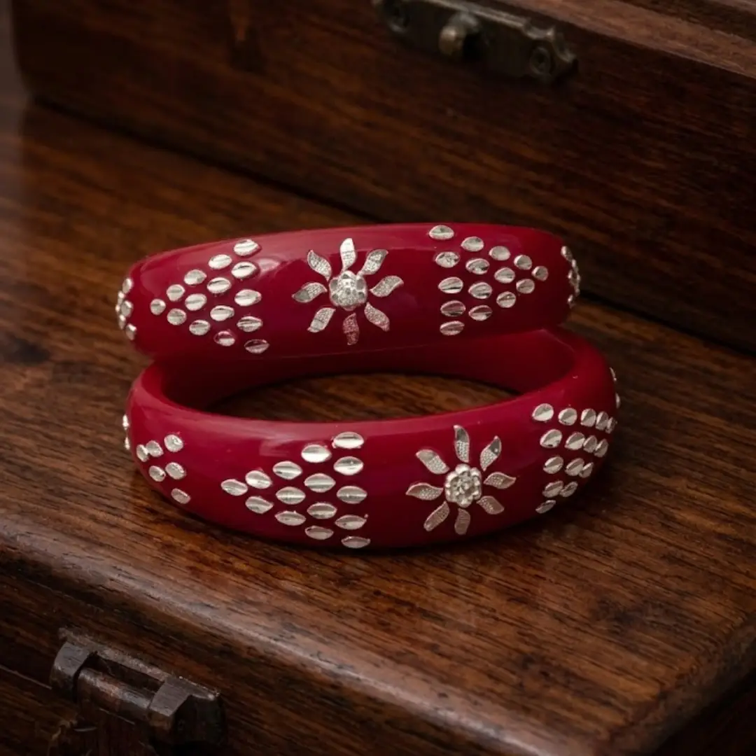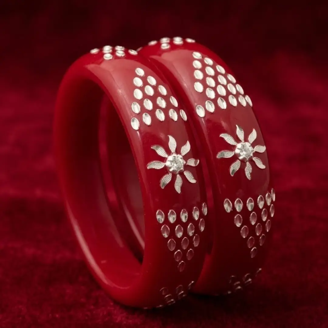 Elevate your traditional grace with our latest 925 Silver Pola Bangle. This exquisite design features a radiant Floral Sun centerpiece flanked by unique triangular Geometric Dot patterns, all handcrafted in high-polished 925 silver. Set against a premium, deep red pola base, this bangle represents a perfect fusion of celestial inspiration and traditional Indian craftsmanship.